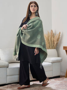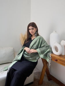 Fresh and unique, this pista green shawl is adorned with soft thread tassels, perfect for layering in cooler weather while keeping it stylish.