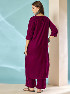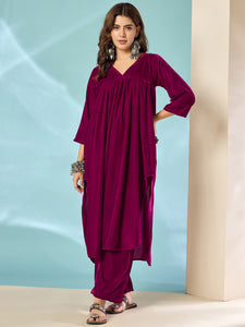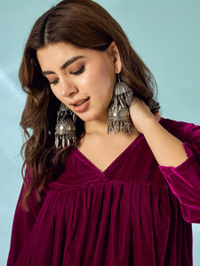 A wine velvet flared kurta set that combines traditional design with modern flair. The flared silhouette and rich fabric make it a perfect choice for festive gatherings and cultural celebrations.