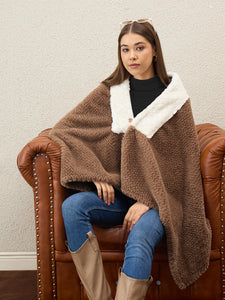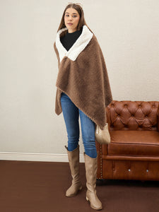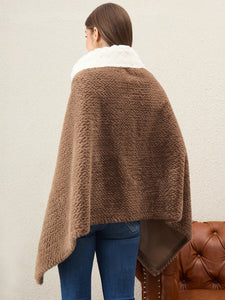 Soft and sophisticated, this light brown textured poncho is accented with white fur trim for a touch of elegance. A cozy choice for any cold-weather occasion.