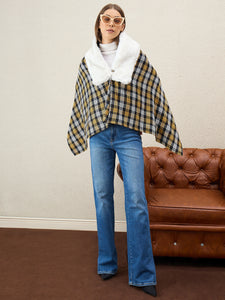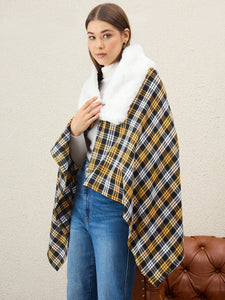 Bright and bold, this yellow and black plaid poncho with white fur trim brings warmth and charm to your outfit. A must-have for fashion-forward comfort.
