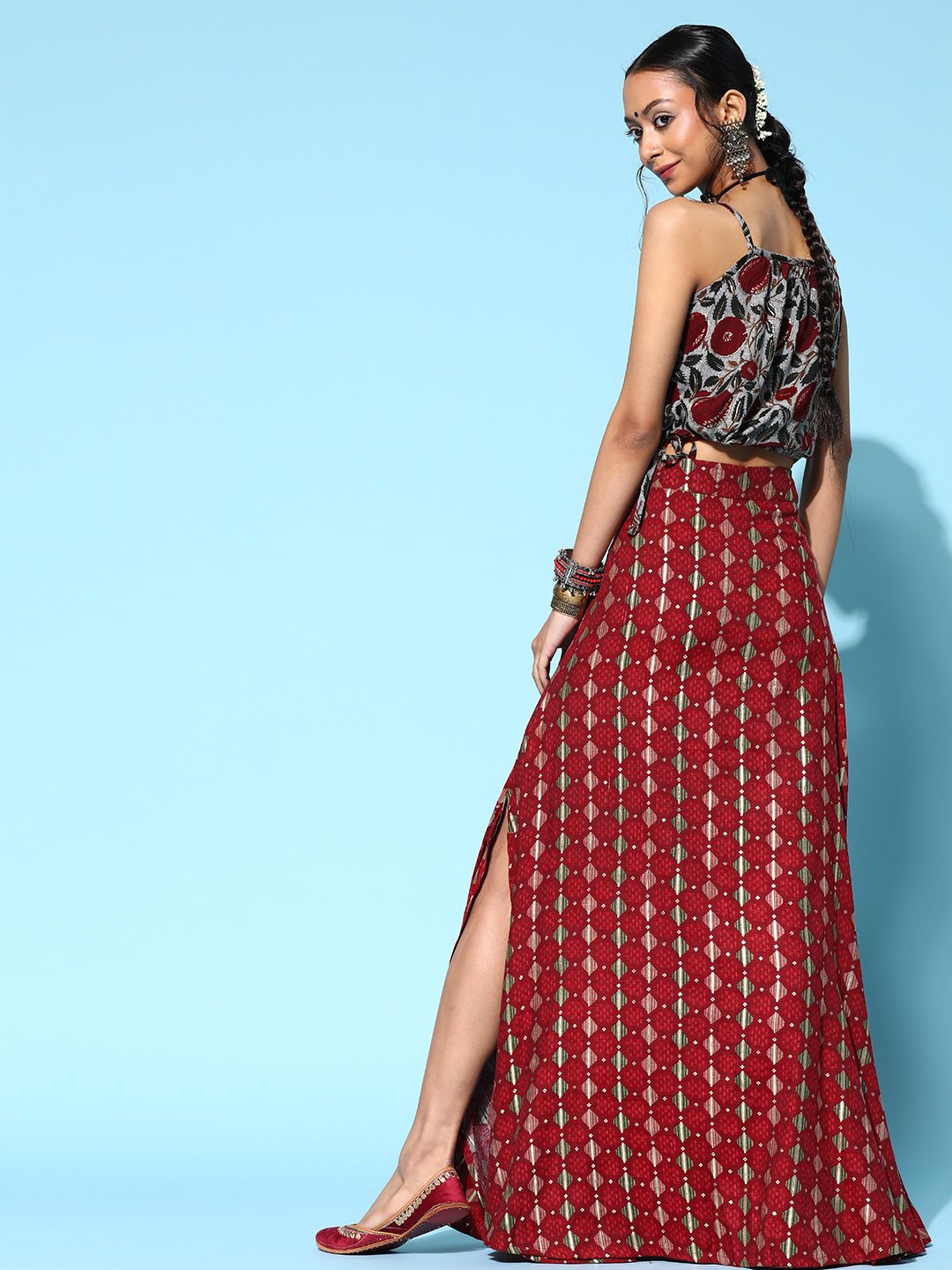 Slate Gray With Garnet Red Crop Top And Skirt