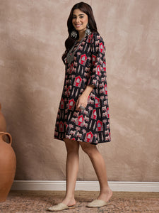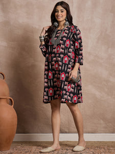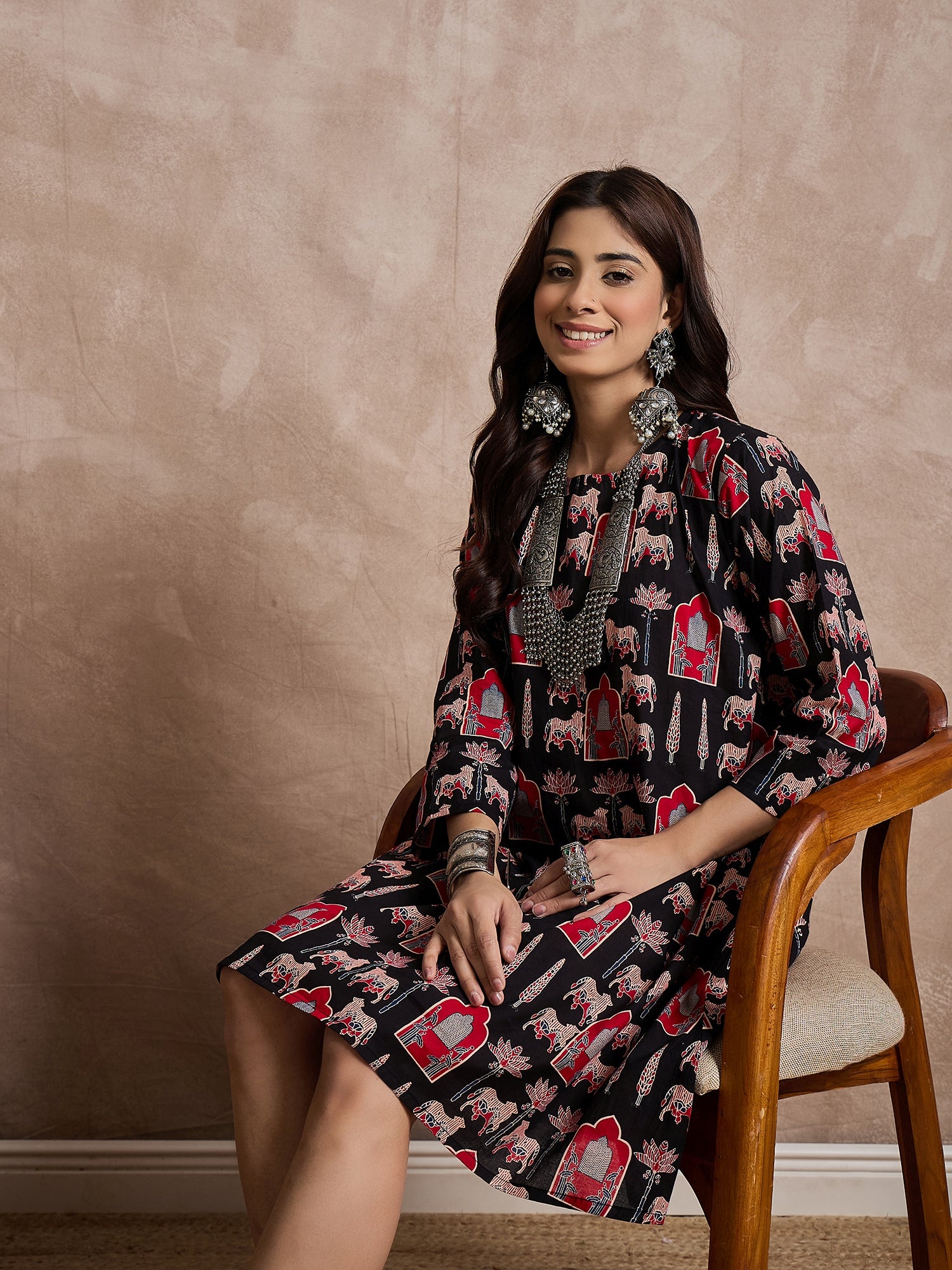 Black & Red Animal Motif Short Dress a fierce blend of edgy style and effortless charm. Featuring a striking red animal print against a classic black base, this dress is tailored for those who love to stand out.