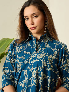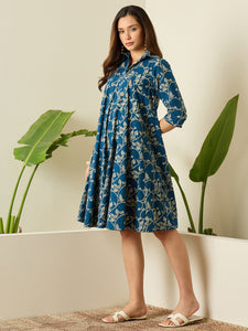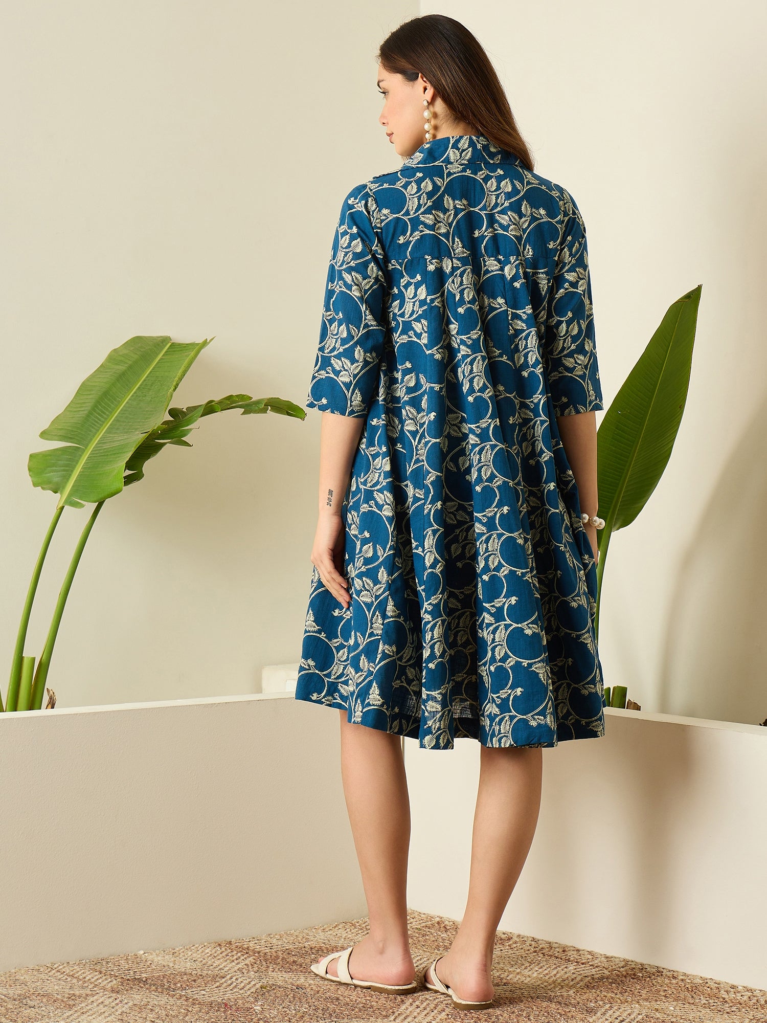 Designed with an intricate leaf jaal print, this teal flared dress adds sophistication to your wardrobe. The breathable fabric and relaxed fit make it perfect for long hours of wear. Ideal for casual outings or cultural gatherings.