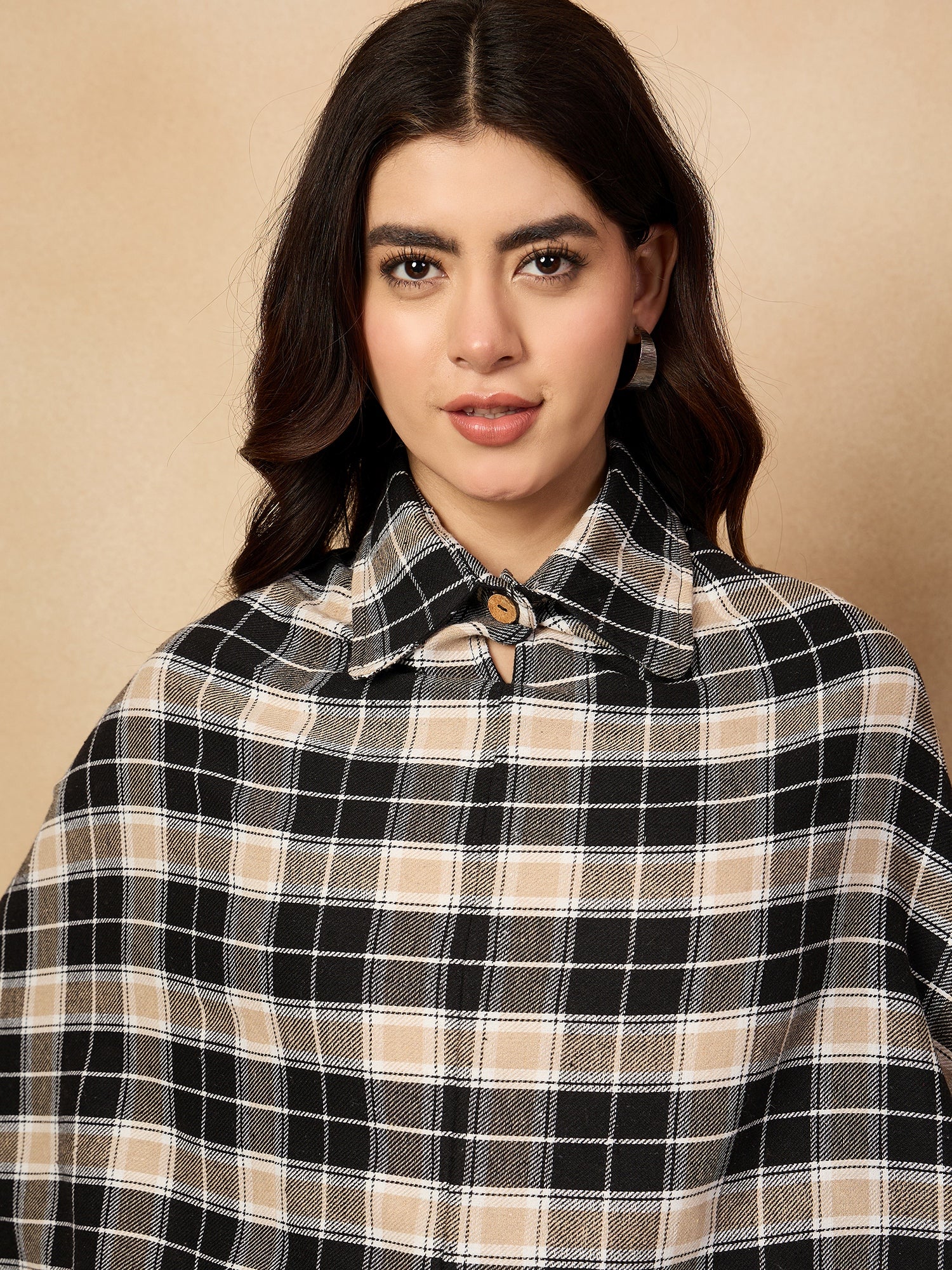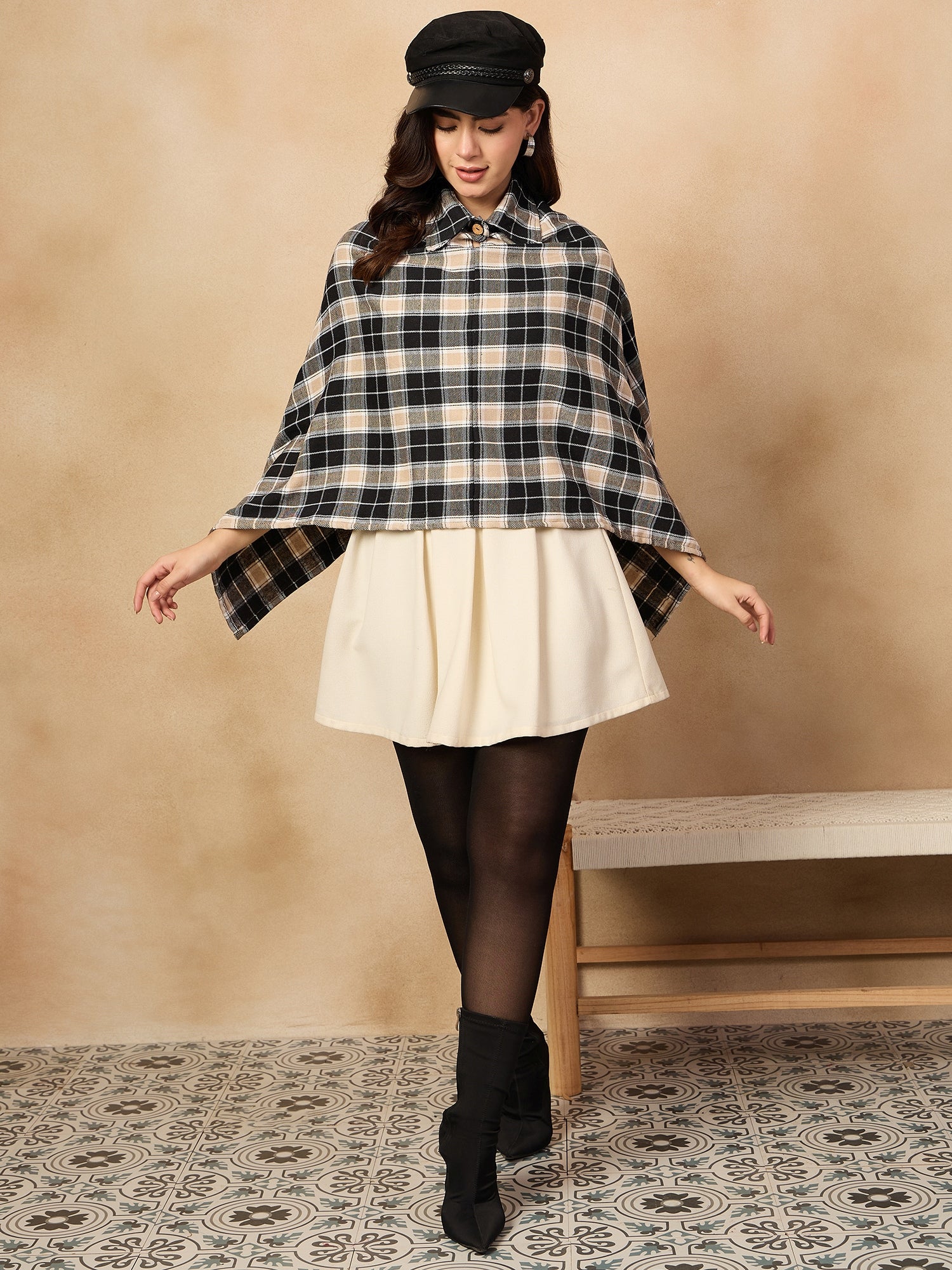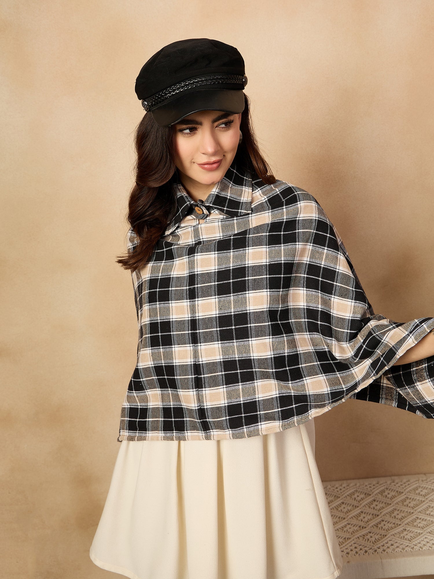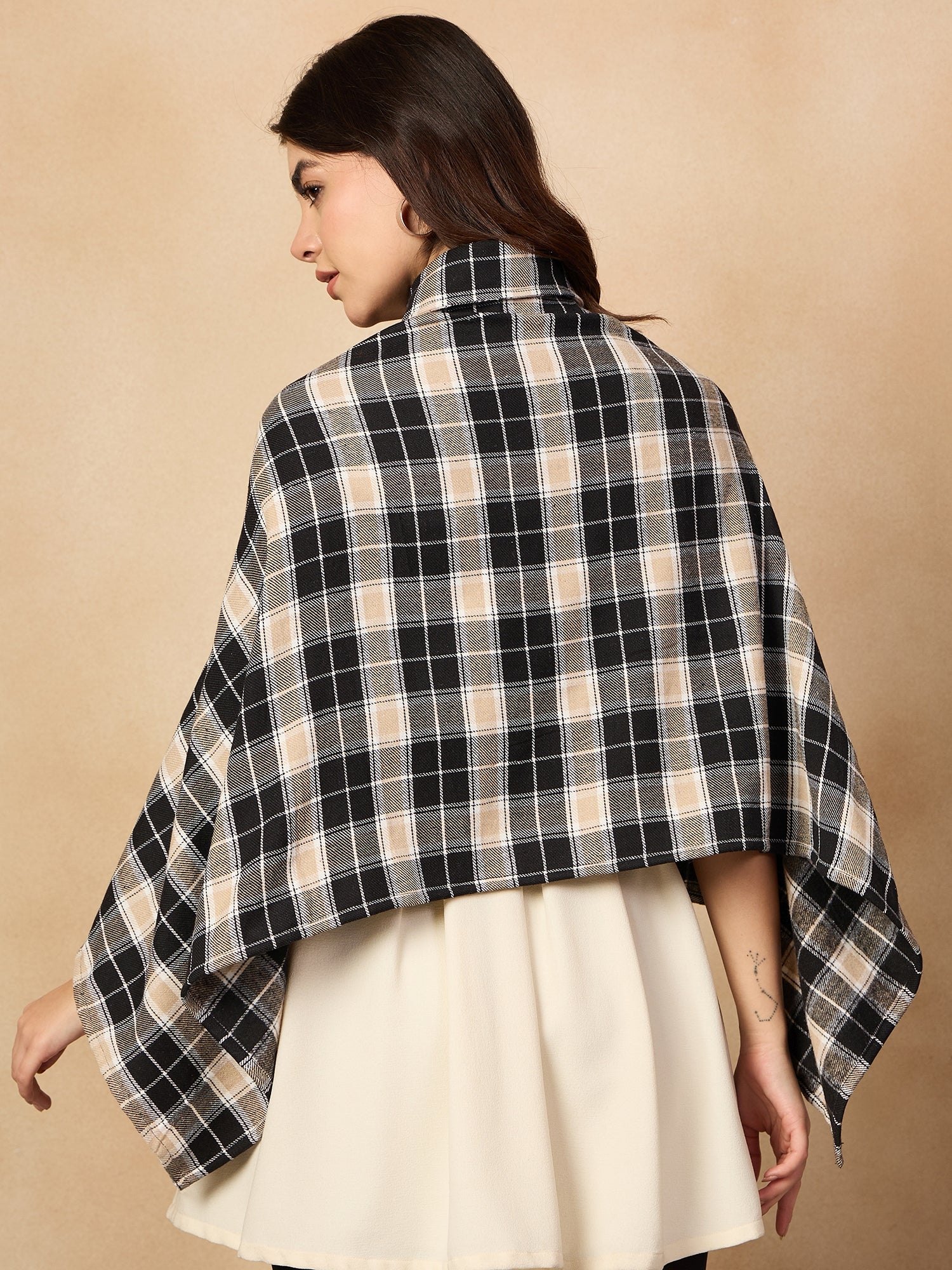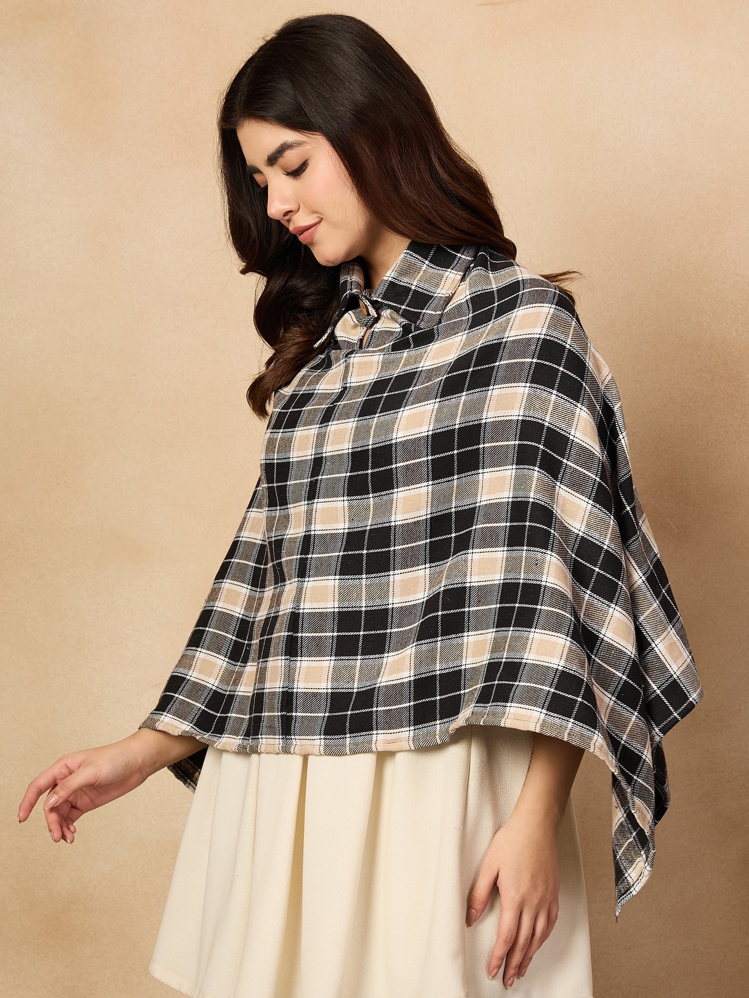 The Black Beige Check Collar Poncho offers a chic and cozy alternative to traditional outerwear. Featuring a classic black and beige checkered pattern, this poncho has a relaxed fit and a stylish high collar for added warmth. Made from a soft and comfortable fabric, it's perfect for layering over outfits during cooler weather. A versatile and trendy piece that combines style and comfort effortlessly.