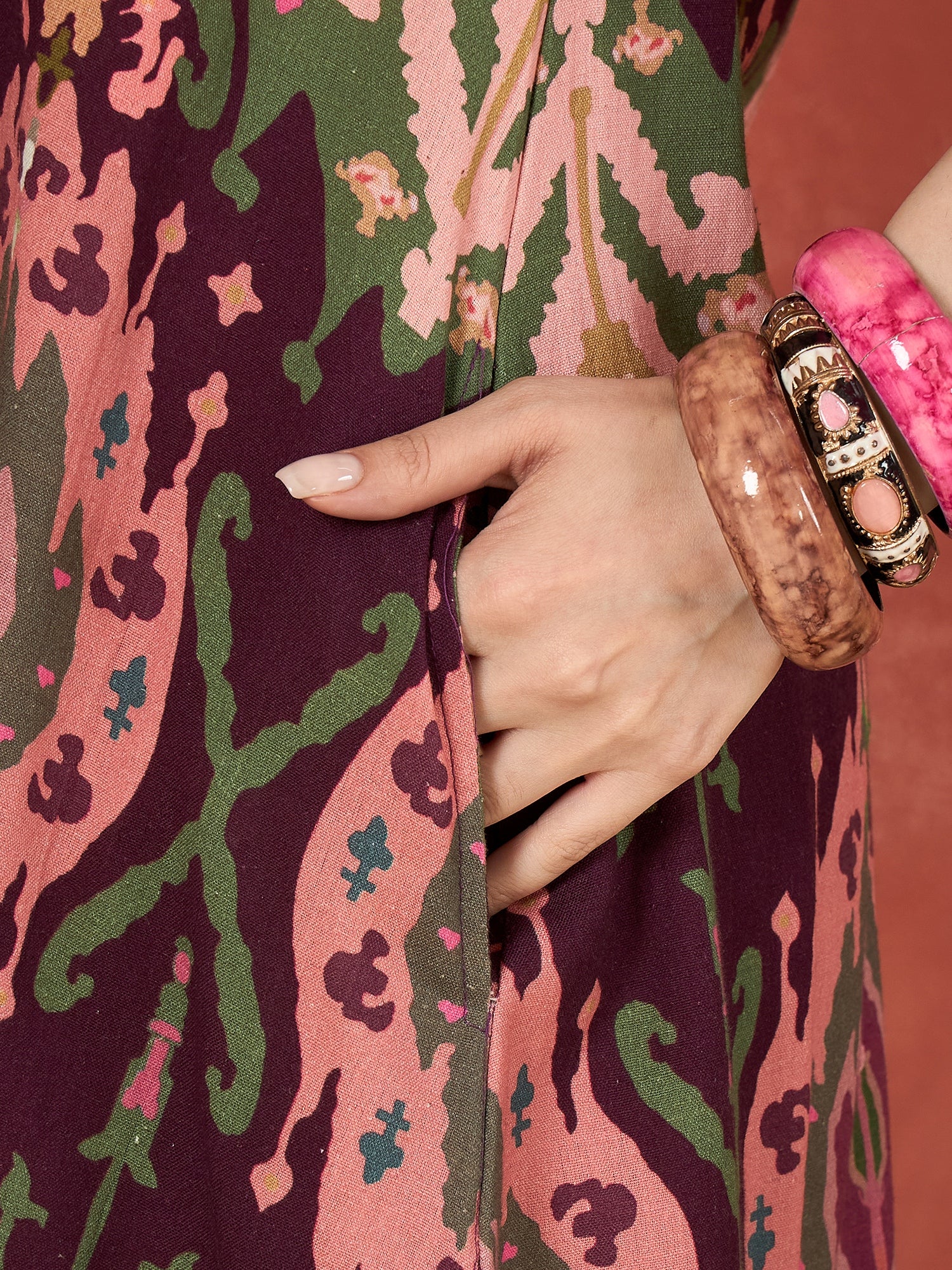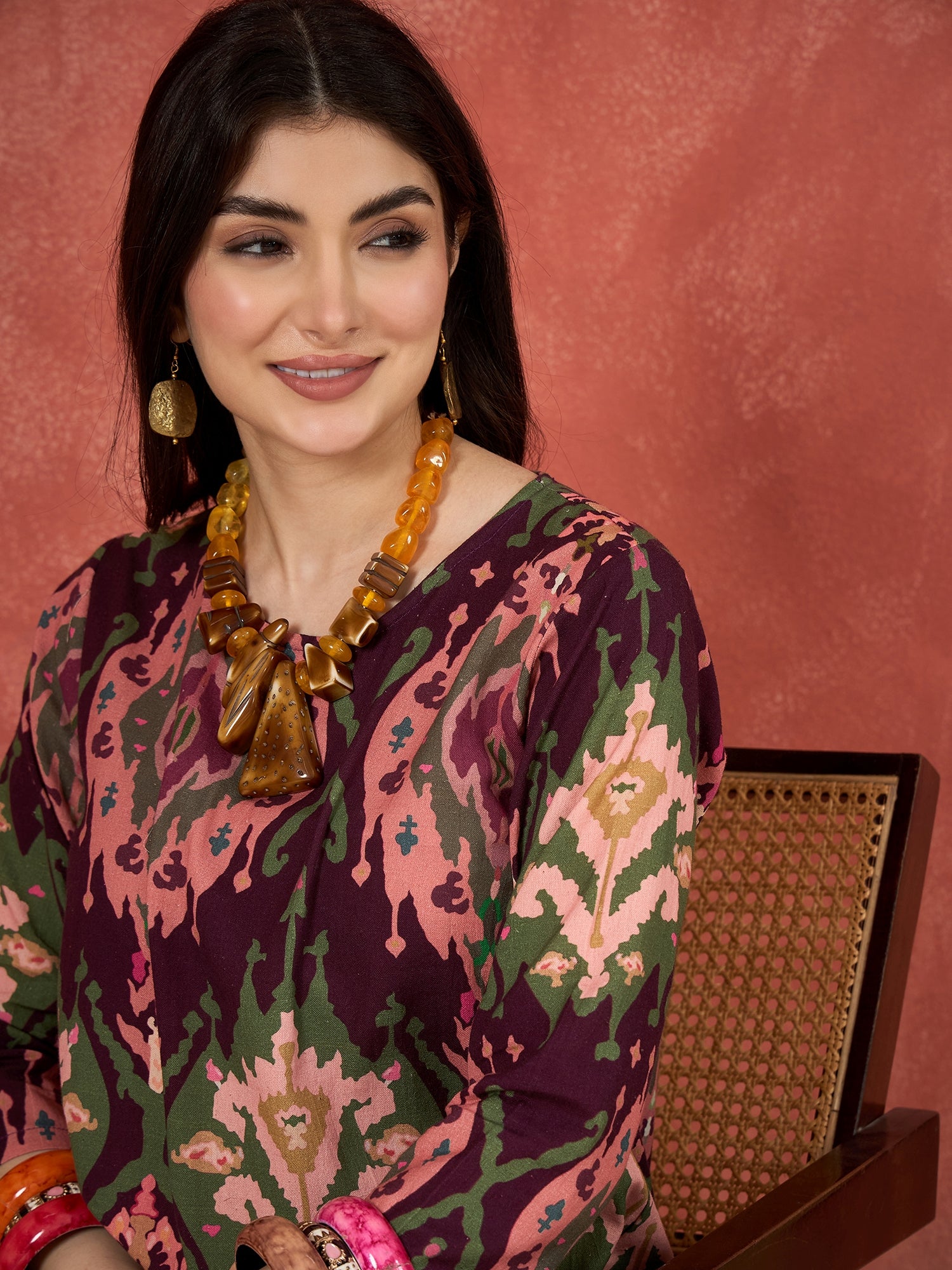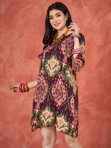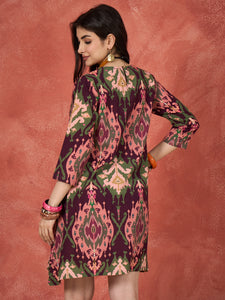 Rich wine tones softened with peach ikkat accents in a round-neck short dress, blending charm with comfort.