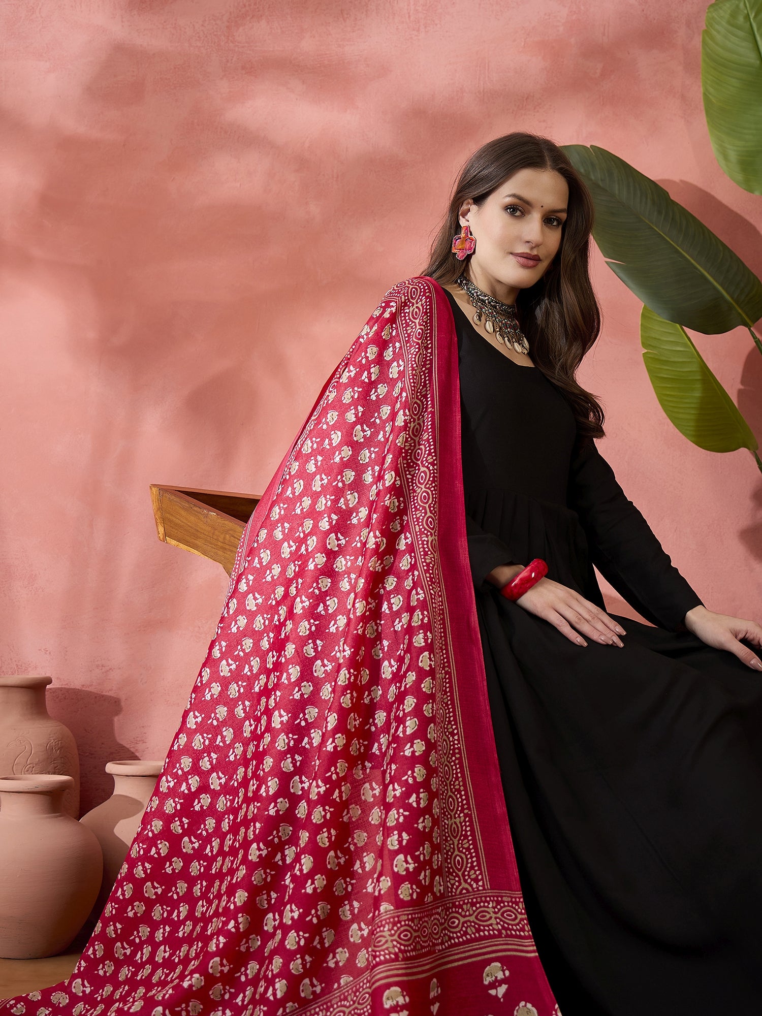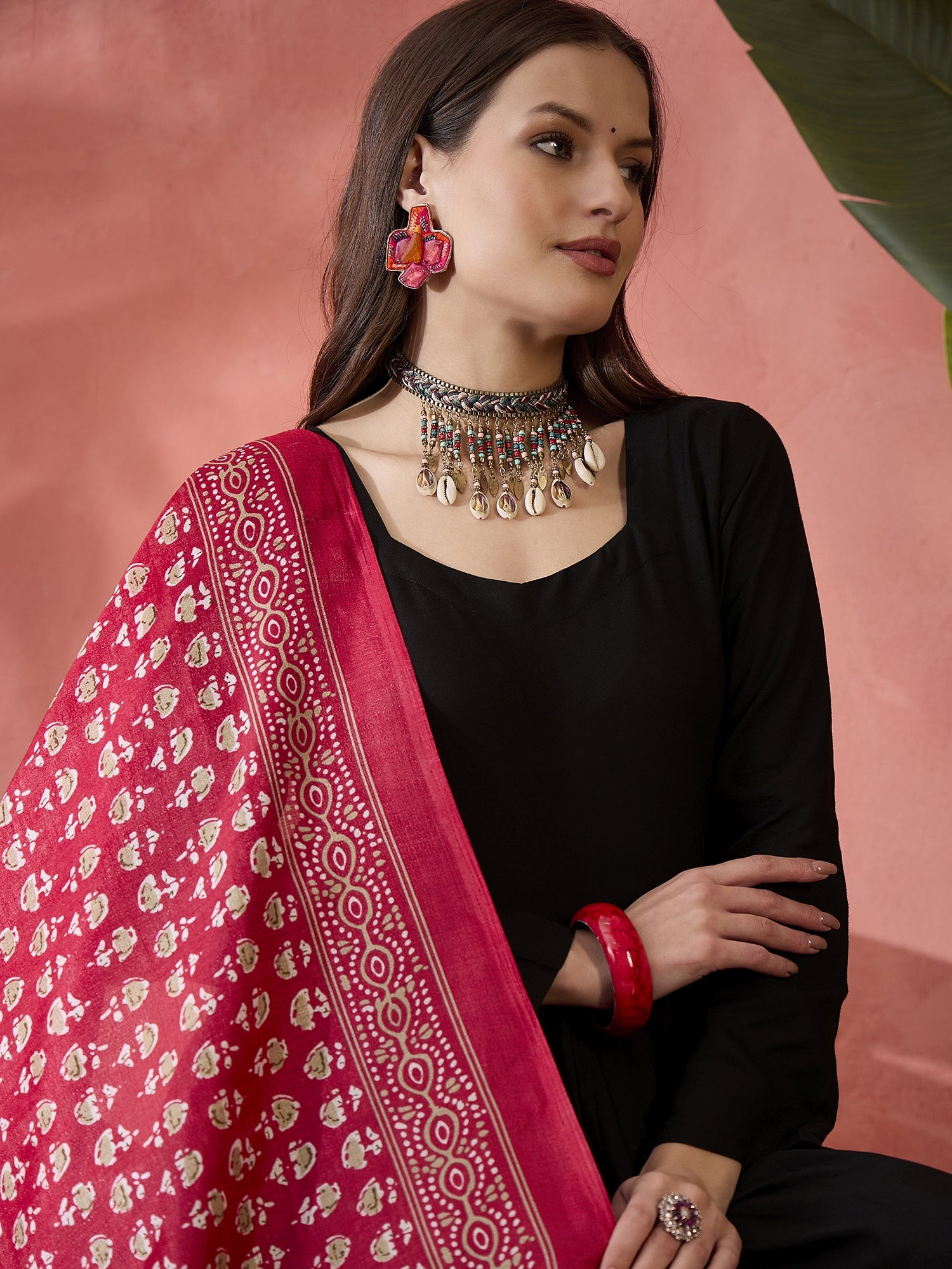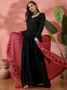 A timeless black sweetheart kurta designed with a graceful silhouette, perfect for both casual and semi-formal occasions. Paired with the dupatta, known for its lightweight, flowing material and subtle embellishments, this combination exudes understated elegance. Fabric - Rayon Dupatta - Faux Silk