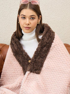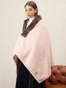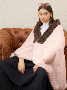 Delicate and fashionable, this light pink textured poncho is complemented by a soft brown fur trim. Perfect for a romantic and cozy winter look.
