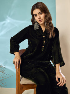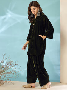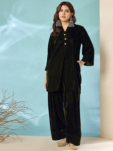 This mehandi green velvet salwar kurta set offers a blend of comfort and style. The rich fabric and traditional design make it a perfect choice for cultural events and festive gatherings.