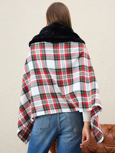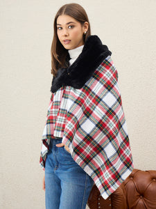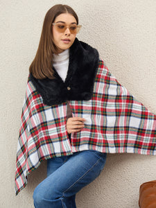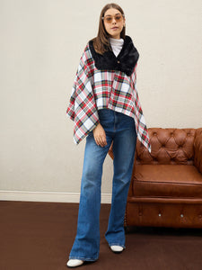 This eye-catching poncho combines white and multicolor plaids with a sleek black fur trim. A fashionable choice for those who love vibrant yet elegant designs.