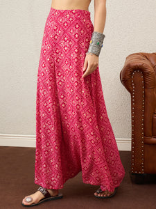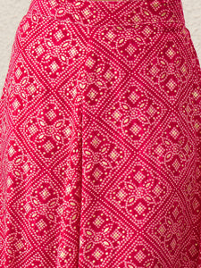 Showcase your festive spirit with this stunning rani pink Bandhej skirt, accentuated with foil detailing. The traditional print and rich hue make it a statement piece for ethnic celebrations.