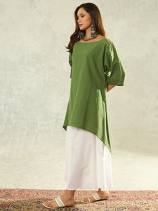 Embrace effortless style with this Green Boat Neck White Palazzo Set. The graceful boat neckline and comfortable palazzo silhouette make it a versatile choice for casual outings and relaxed festive looks.