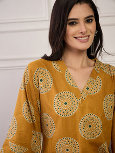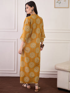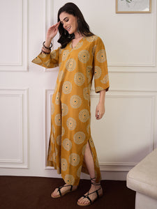 This mustard V-neck long dress showcases a graceful fall with a charming block print. Made from breathable fabric, it offers all-day comfort and effortless style. A great choice for day wear, casual gatherings, or relaxed festive looks.