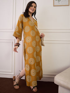 Mustard Geometric Circles Print V Neck Long Dress