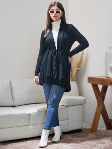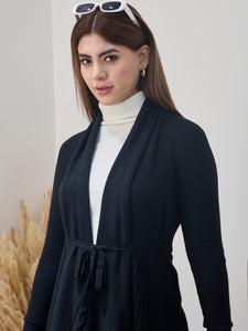 Black striped tie-up shrug with vertical lines and adjustable front tie modern, sleek layering piece.
