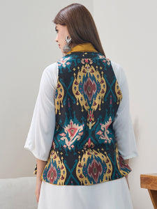 This reversible shrug showcases a traditional black ikkat pattern on one side and a vibrant yellow on the other. Its lightweight fabric and versatile design make it a stylish addition to any outfit.