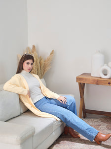 Light yellow, breathable longline shrug with open front and functional patch pockets designed for effortless layering.