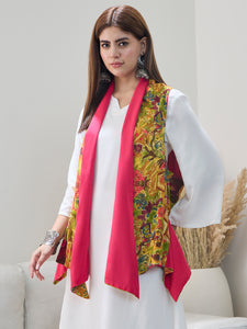 A vibrant mustard and pink reversible shrug that offers two distinct looks. The lightweight fabric and versatile design make it a stylish addition to your wardrobe, suitable for various occasions.