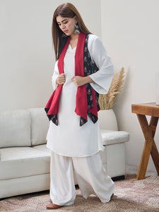 This reversible shrug offers two distinct looks: a black side adorned with booti embroidery and a maroon side with intricate detailing. The lightweight fabric ensures comfort.