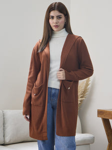 Rust longline shrug with front pockets, relaxed fit, ideal for transitional styling.
