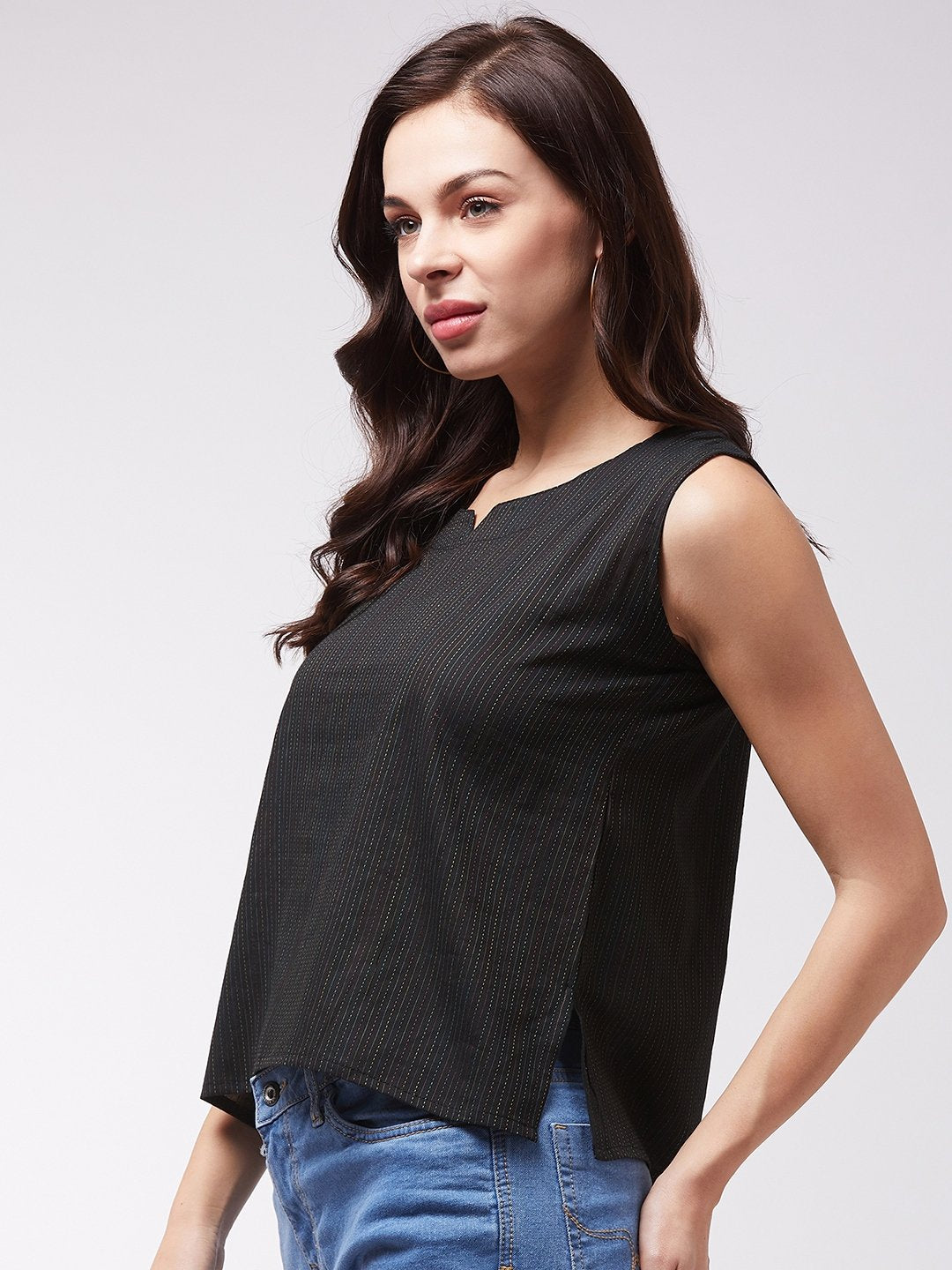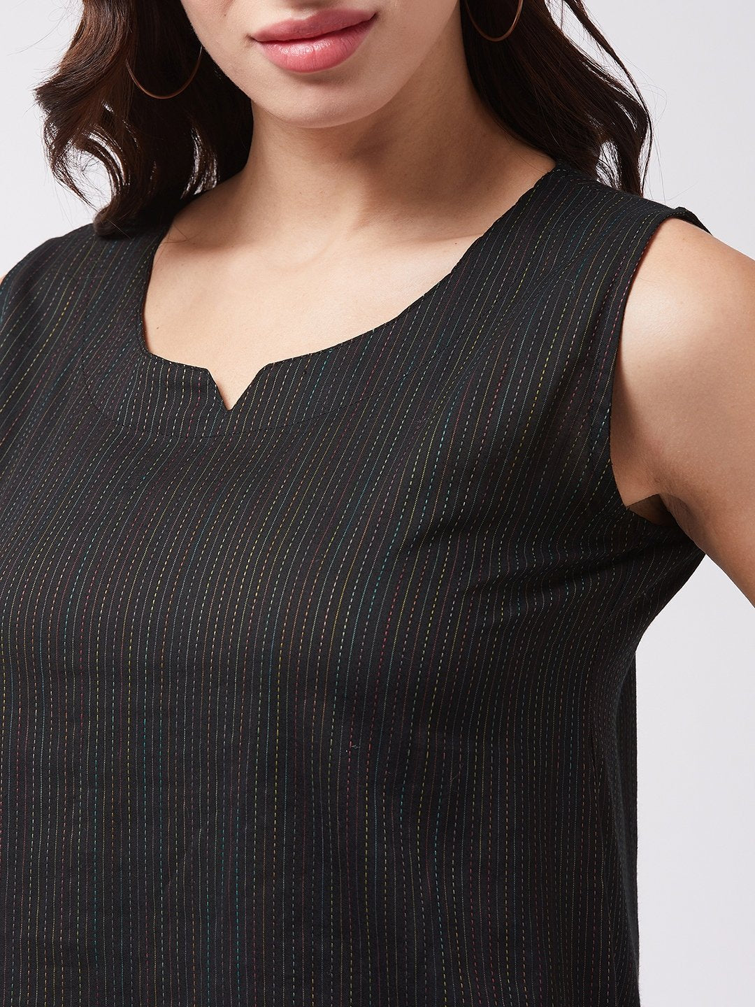 Spruce up your classic ethnic look in no time by dolling up in this black kantha top. You can pair it with jeans, culottes as well as traditional skirts.