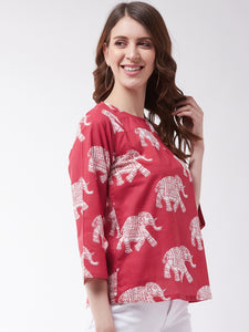 Red Elephant print regular top Round neck, Conversational print three-quarter regular sleeves Woven cotton Button closure.