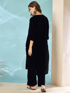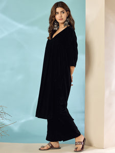 This black velvet kurta set features a flared silhouette, combining traditional design with modern flair. The rich fabric and elegant cut make it suitable for festive occasions or formal gatherings.