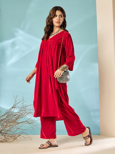 A pinkish red velvet flared kurta set that combines traditional design with modern flair. The flared silhouette and rich fabric make it a perfect choice for festive gatherings ,cultural celebrations.