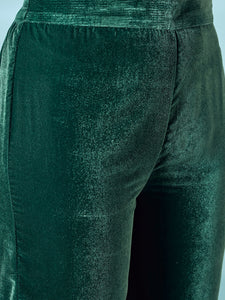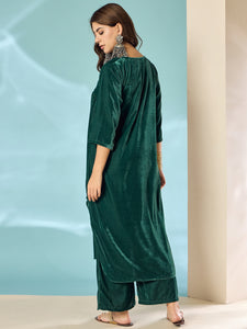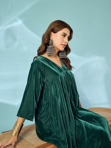 A stylish teal green velvet flared kurta set that combines traditional design. The flared silhouette and rich fabric make it a perfect choice for festive gatherings and cultural celebrations.