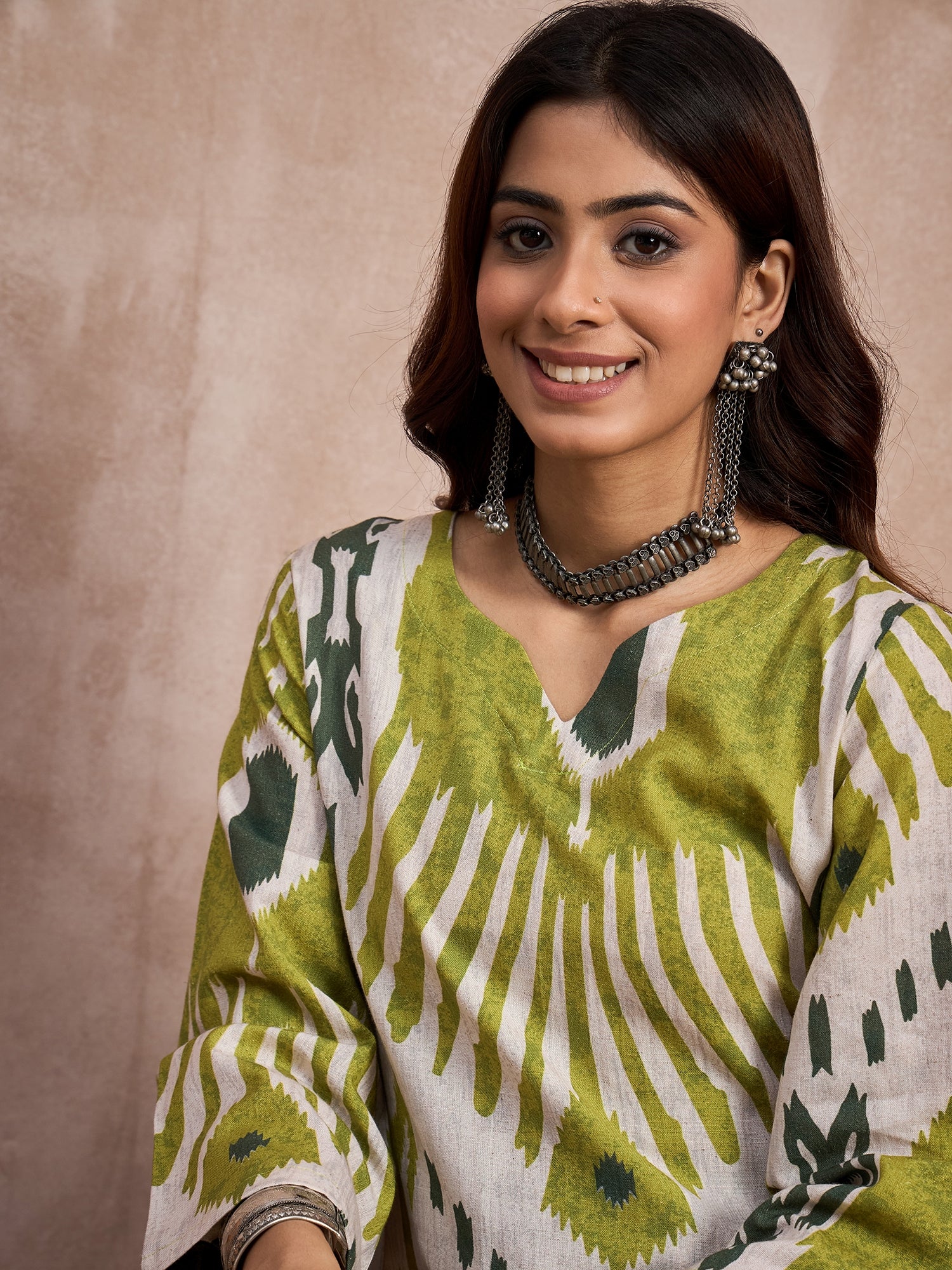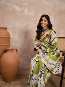 Olive White Ikkat Print Long Sleeve Kurta Set