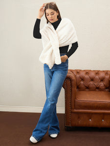 The soft white fabric and elegant fur trim make it an essential piece for sophisticated layering in any season.