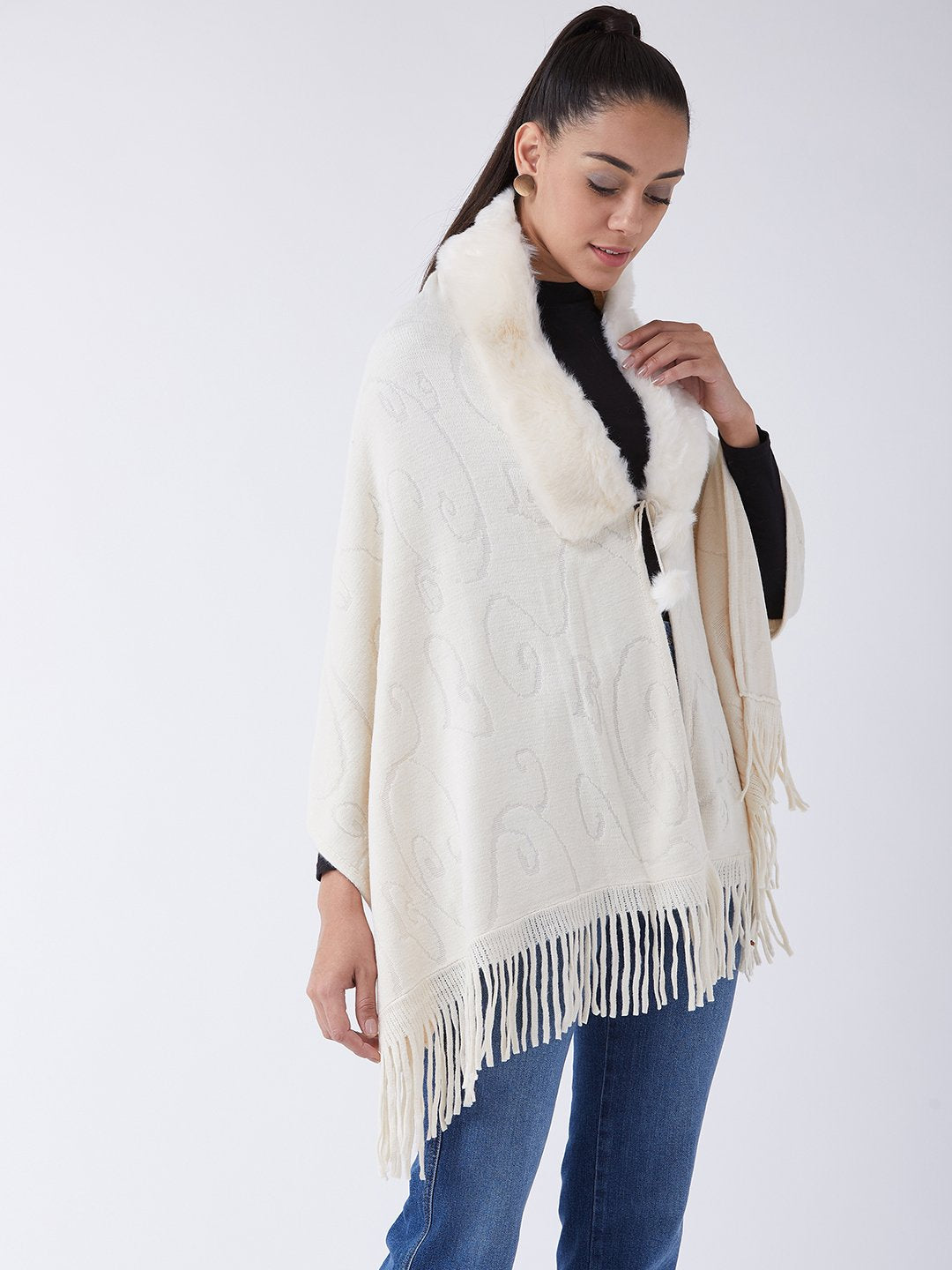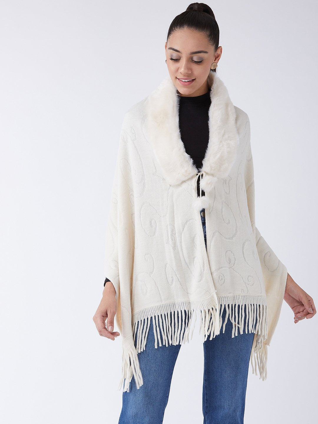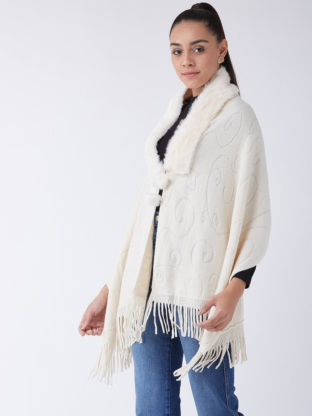 Stylish Fur Cape from InWeave can be worn two ways,wear it like a shawl or like a poncho for different looks. Product made of Acrylic. Dry Clean Recommended