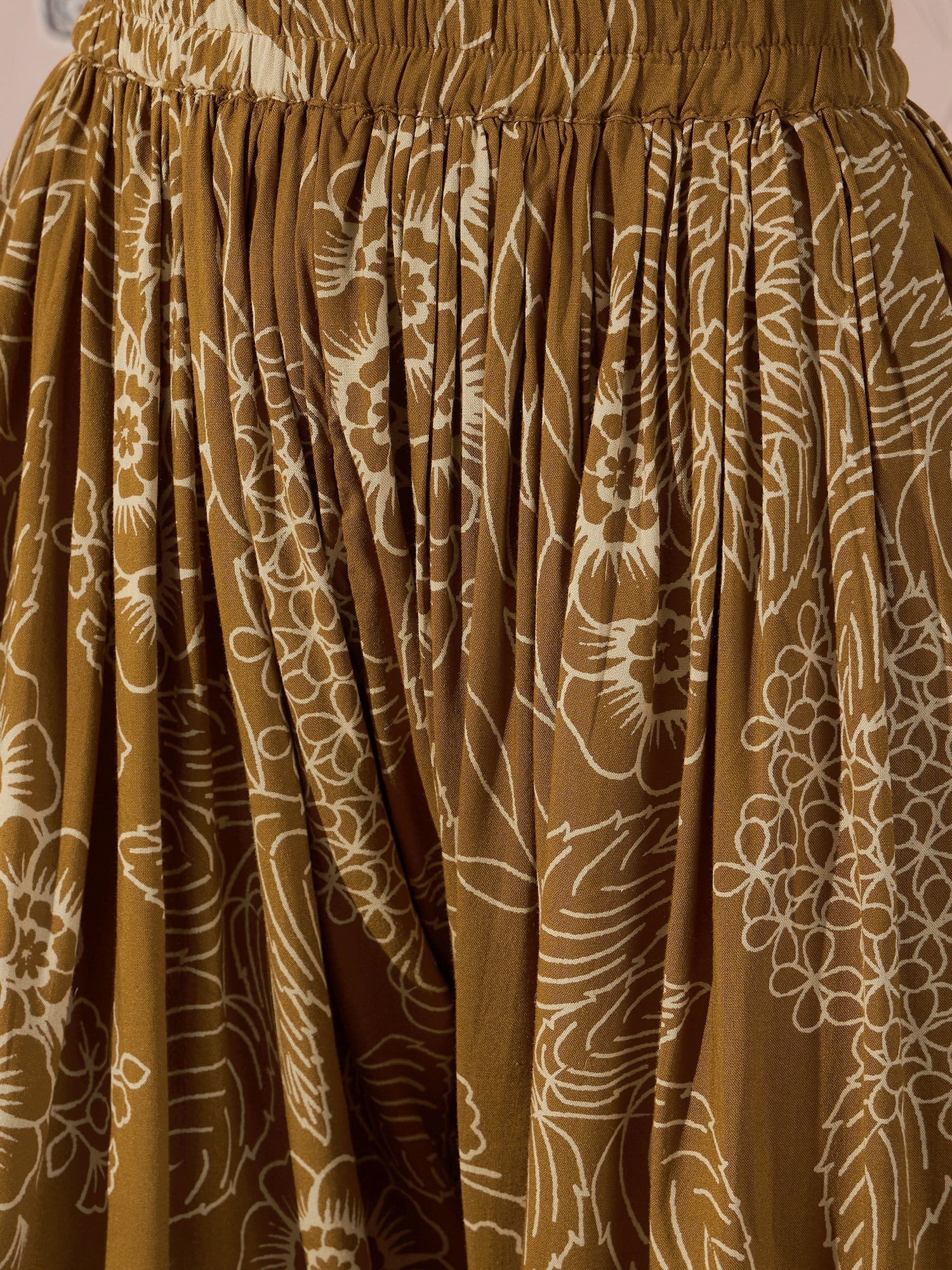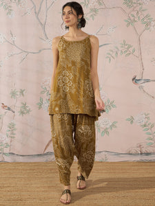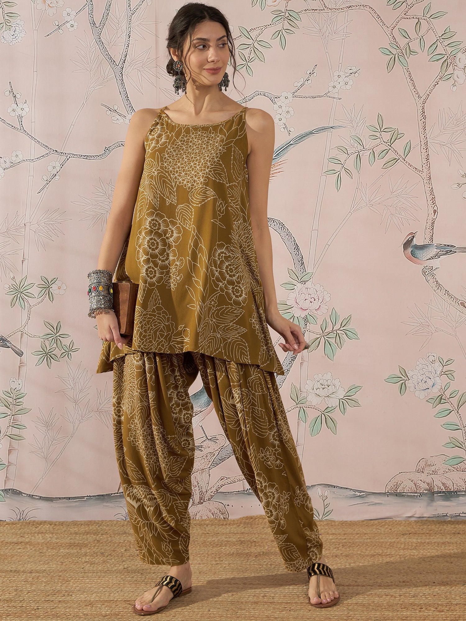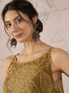 A set featuring a dark yellow color, with a delicate rose and leaf pattern. The strappy design adds a light and summery feel, making it perfect for casual outdoor events or garden parties. The earthy tones of the yellow create a warm and inviting look.