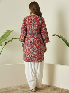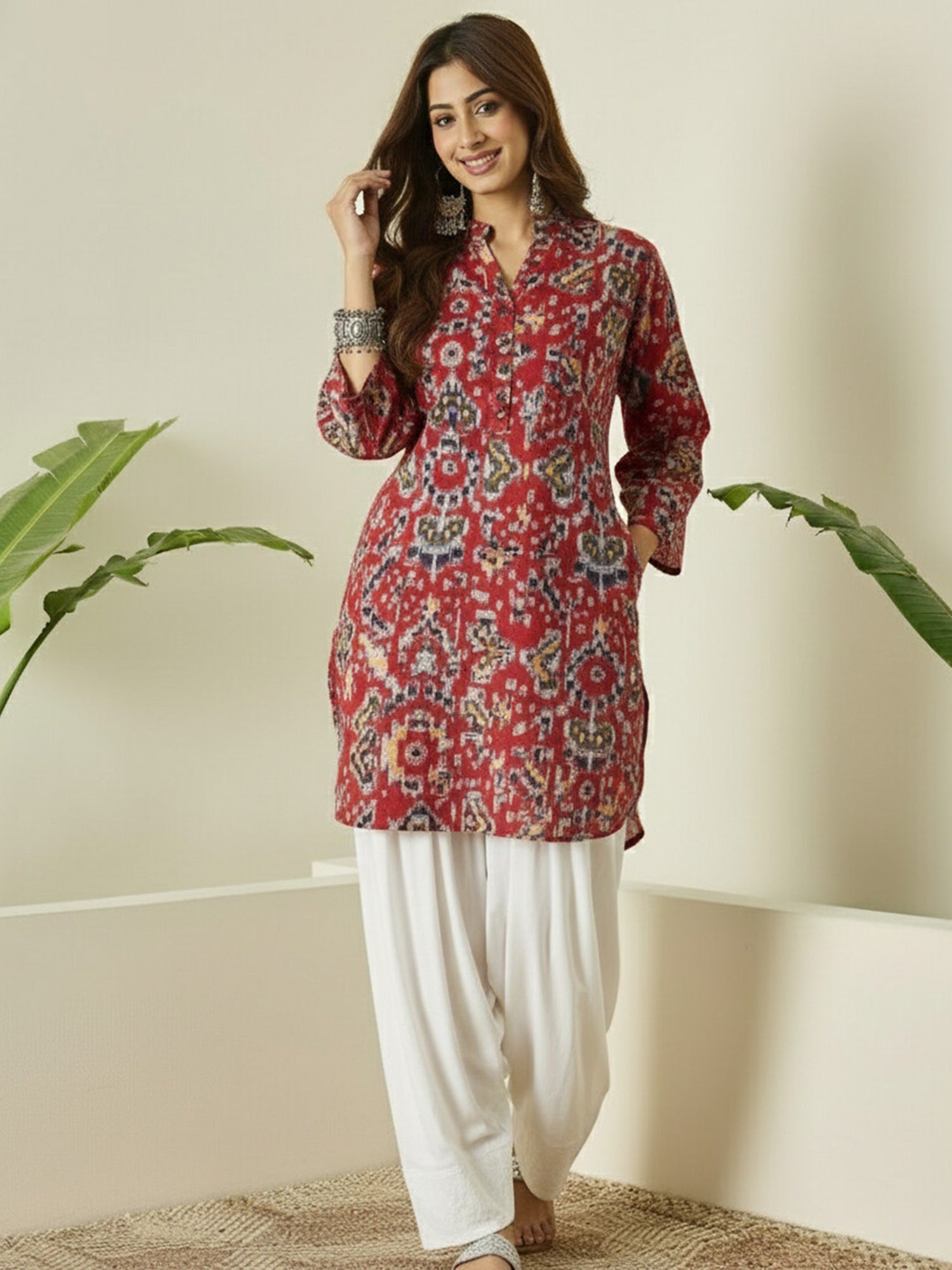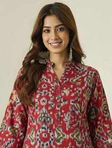 Abstract ikkat print kurta paired with white salwar, featuring a classic ethnic silhouette, breathable fabric, and elegant design, perfect for festive occasions and comfortable everyday traditional wear.