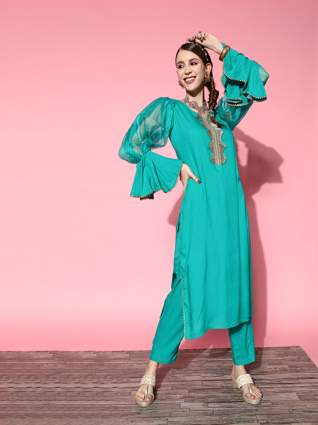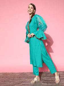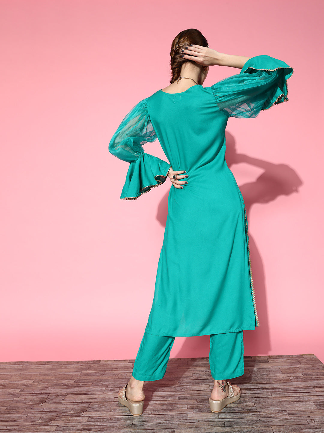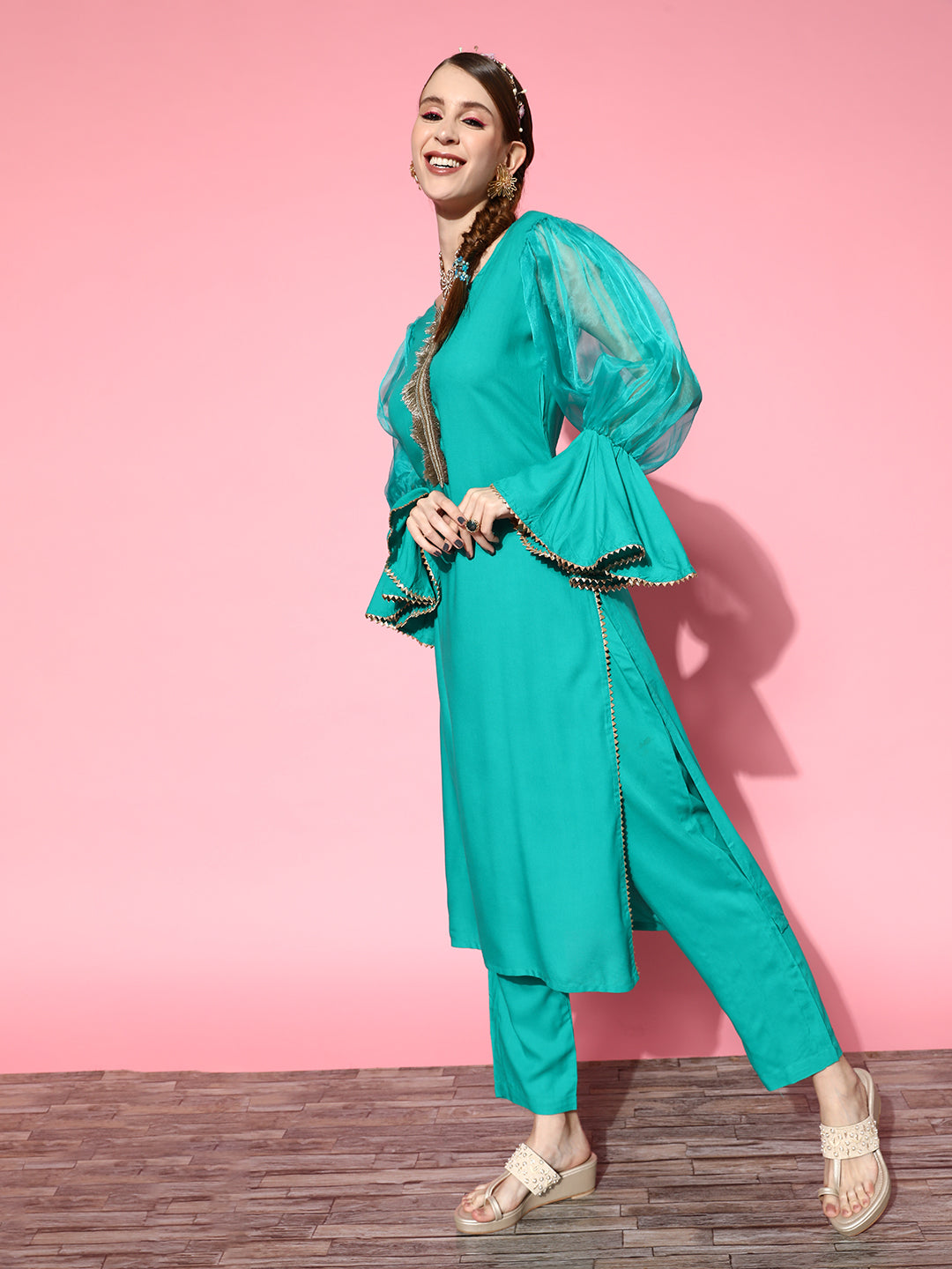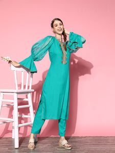 Placeholder Aqua Organza Sleeve Gota Work Kurta Set - InWeave