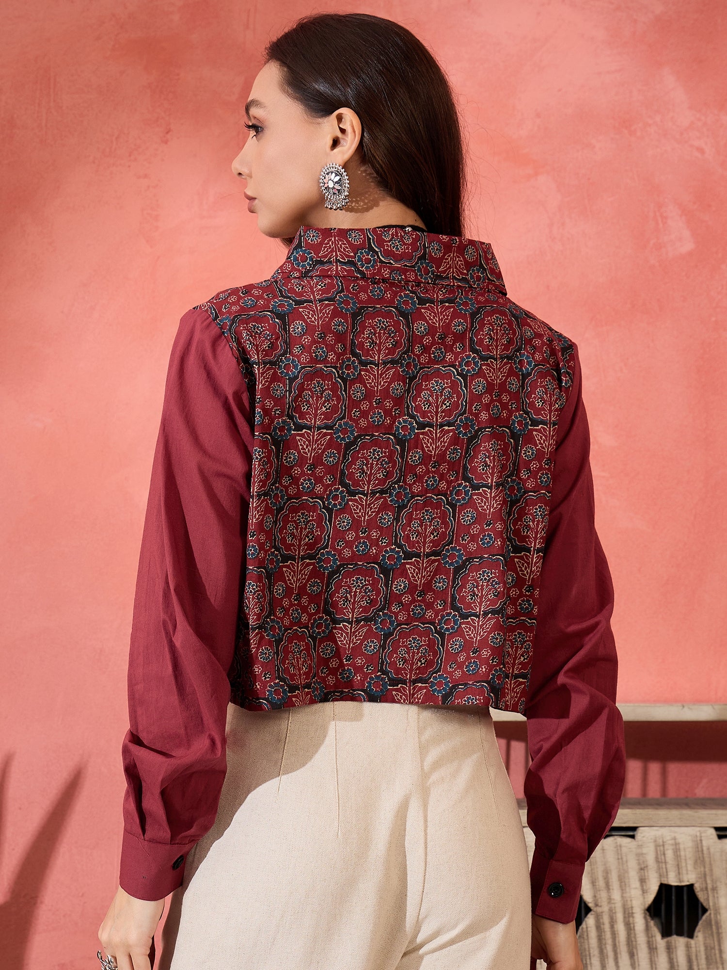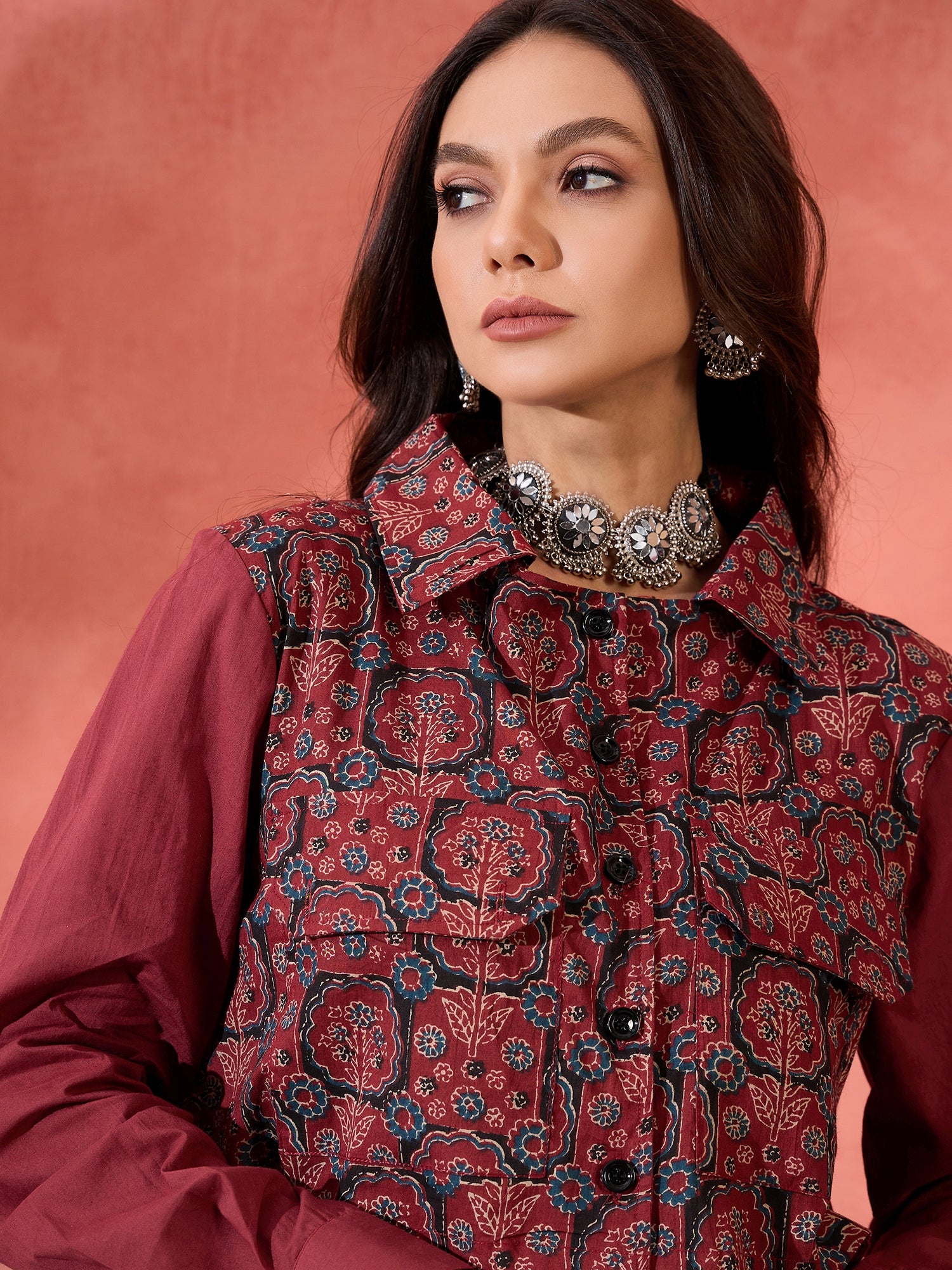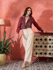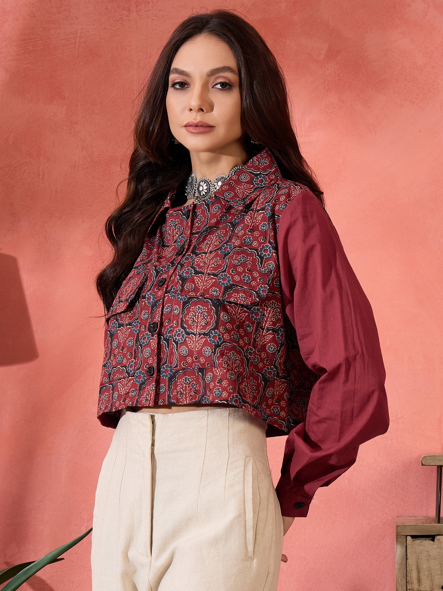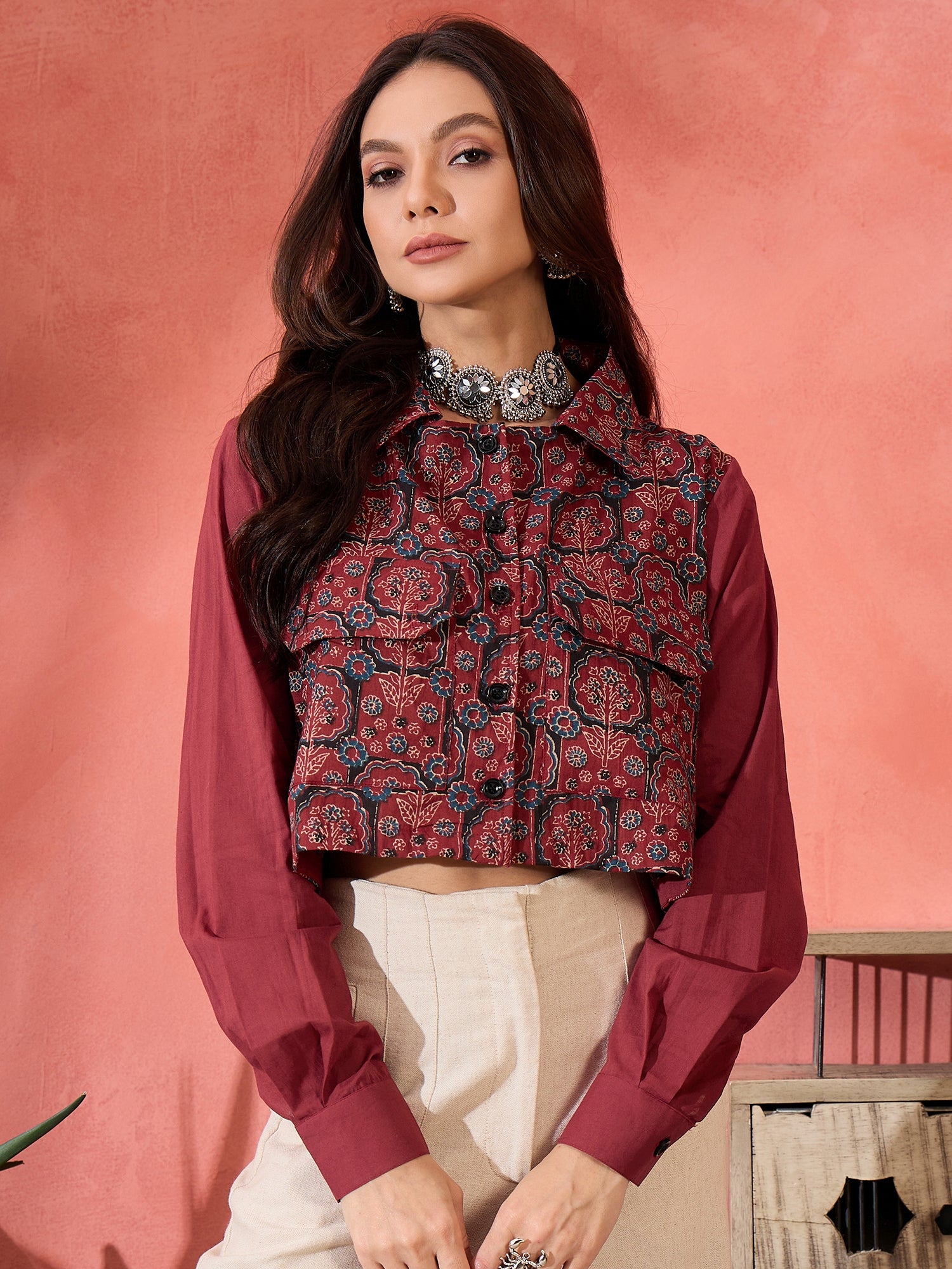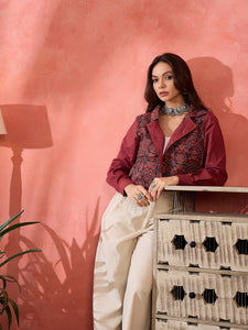 A vibrant jacket featuring a rich barn red and blue Kalamkari print, with practical pockets for added style and utility. The traditional print adds a unique, cultural touch, making it perfect for casual or semi-formal outfits.