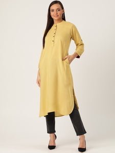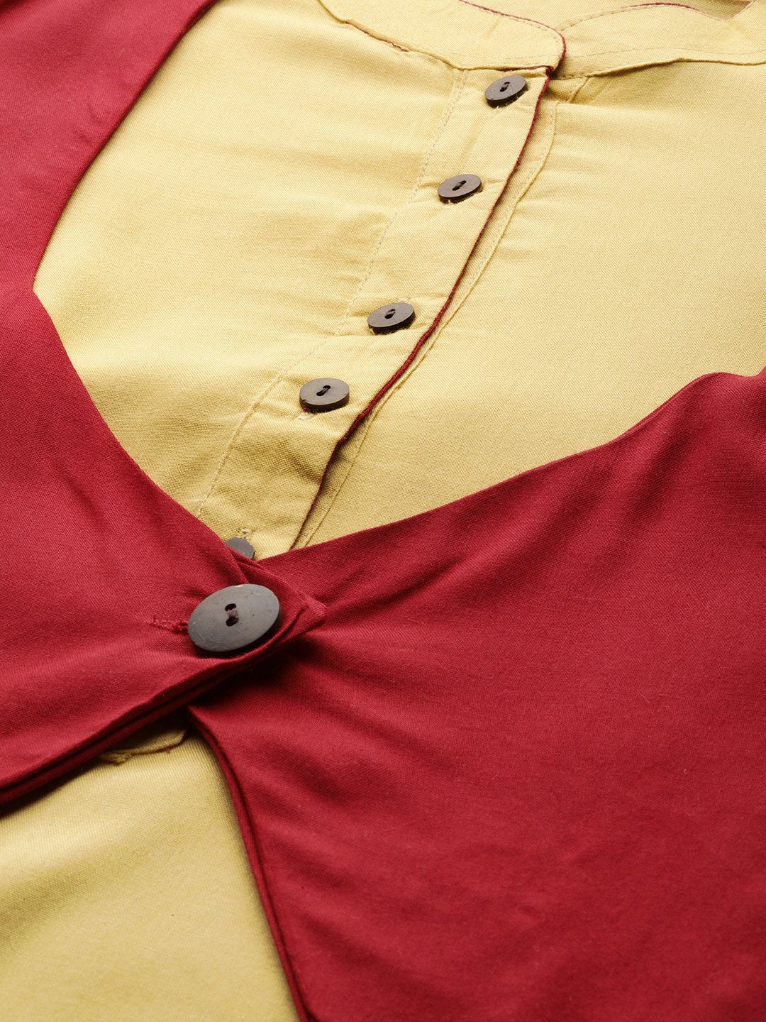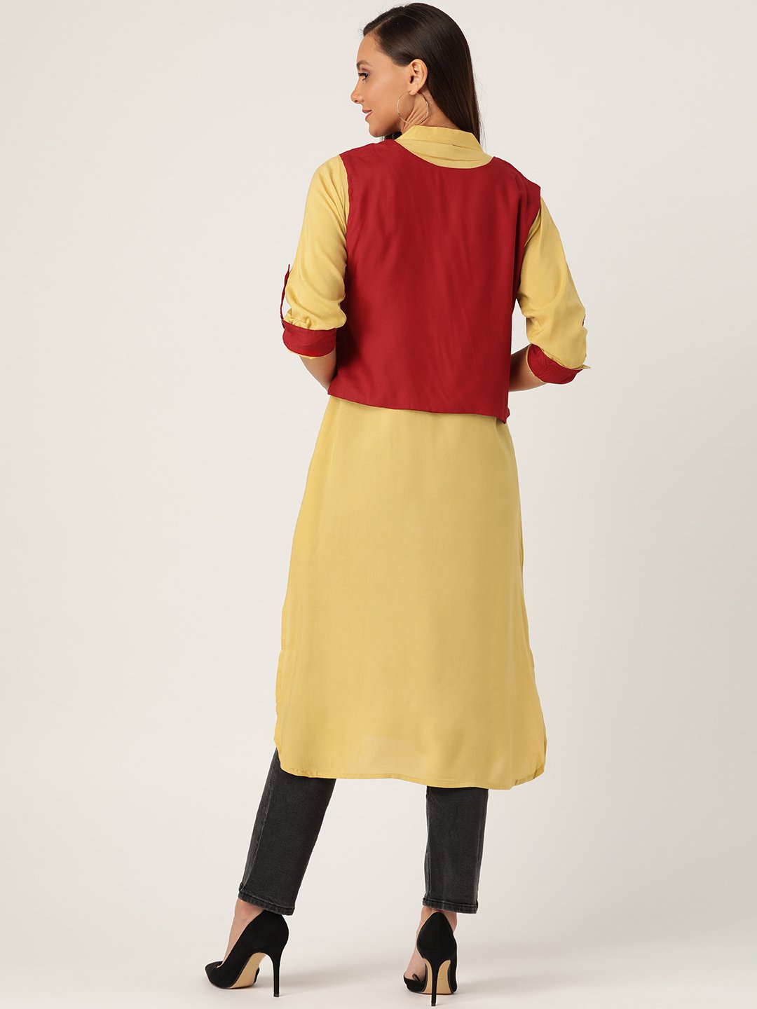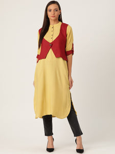 Flaunt a little bit more among your friends and peers by appearing in this beige coloured kurta and maroon shrug set. Pair the set with white palazzo.