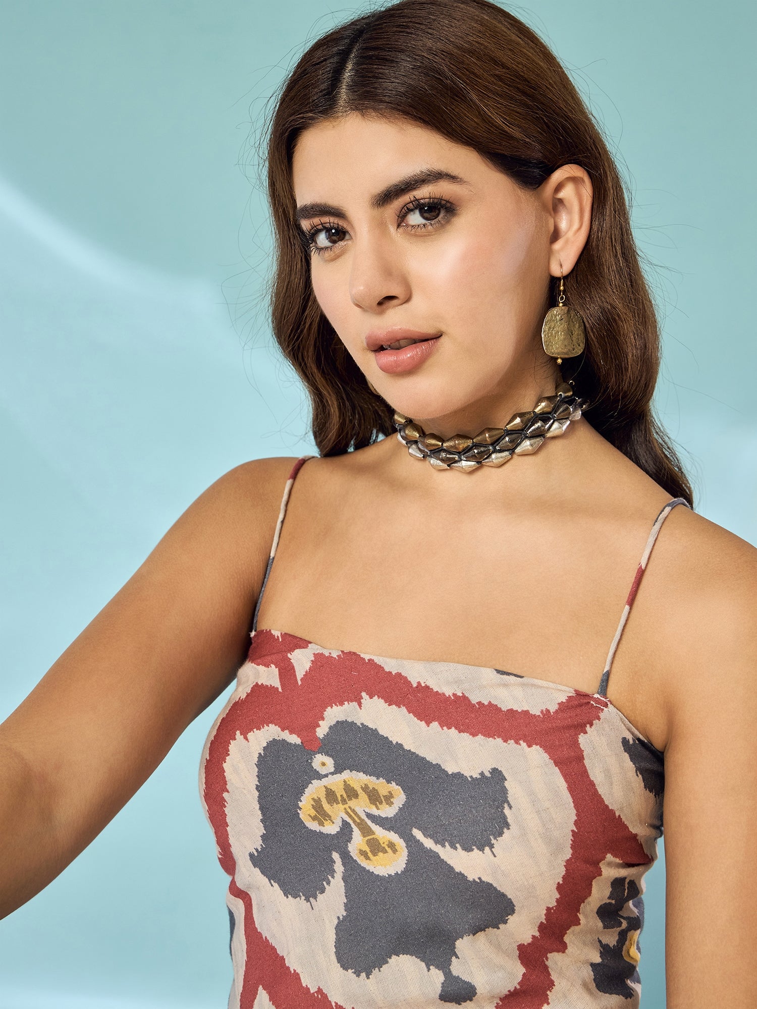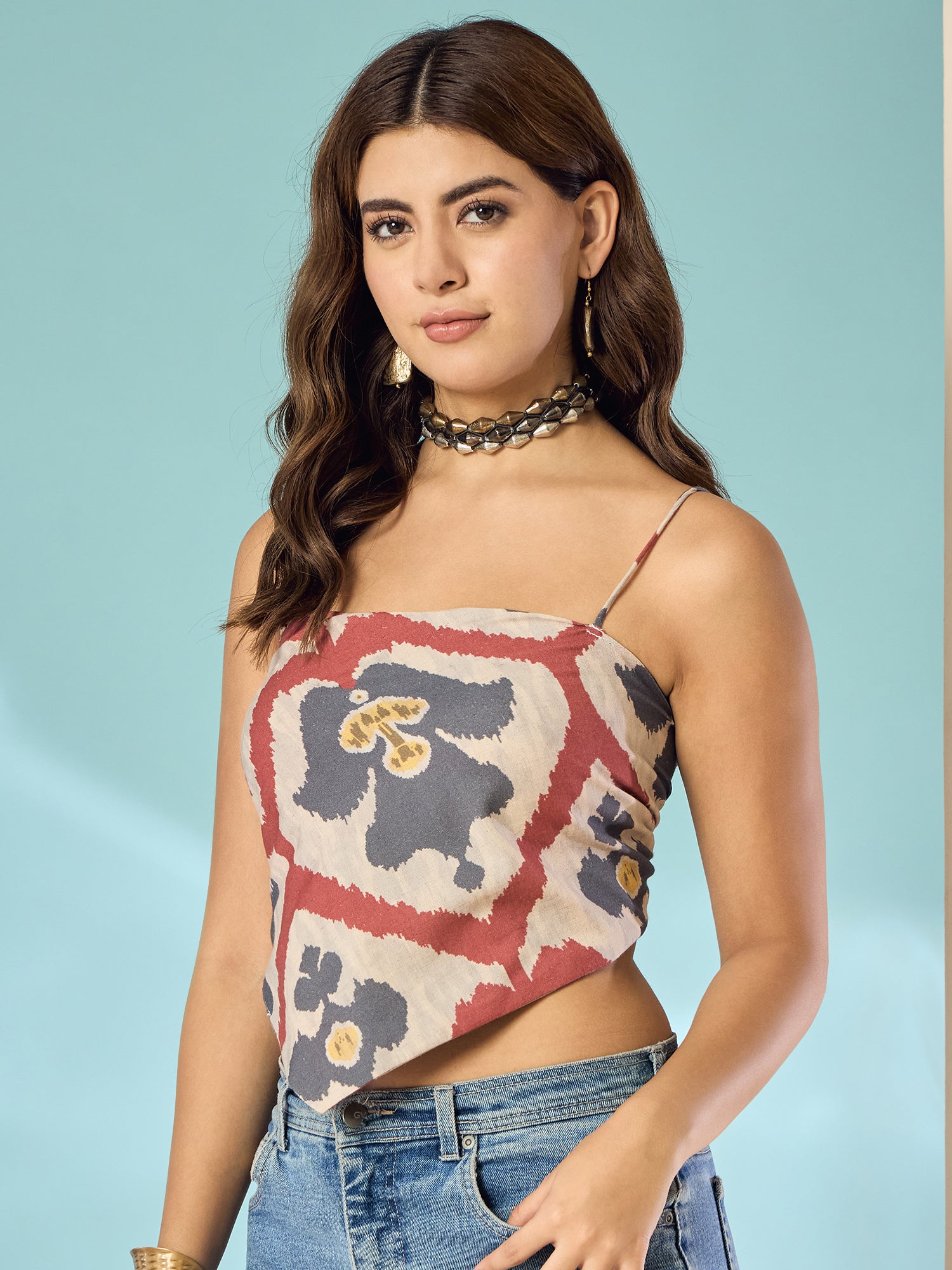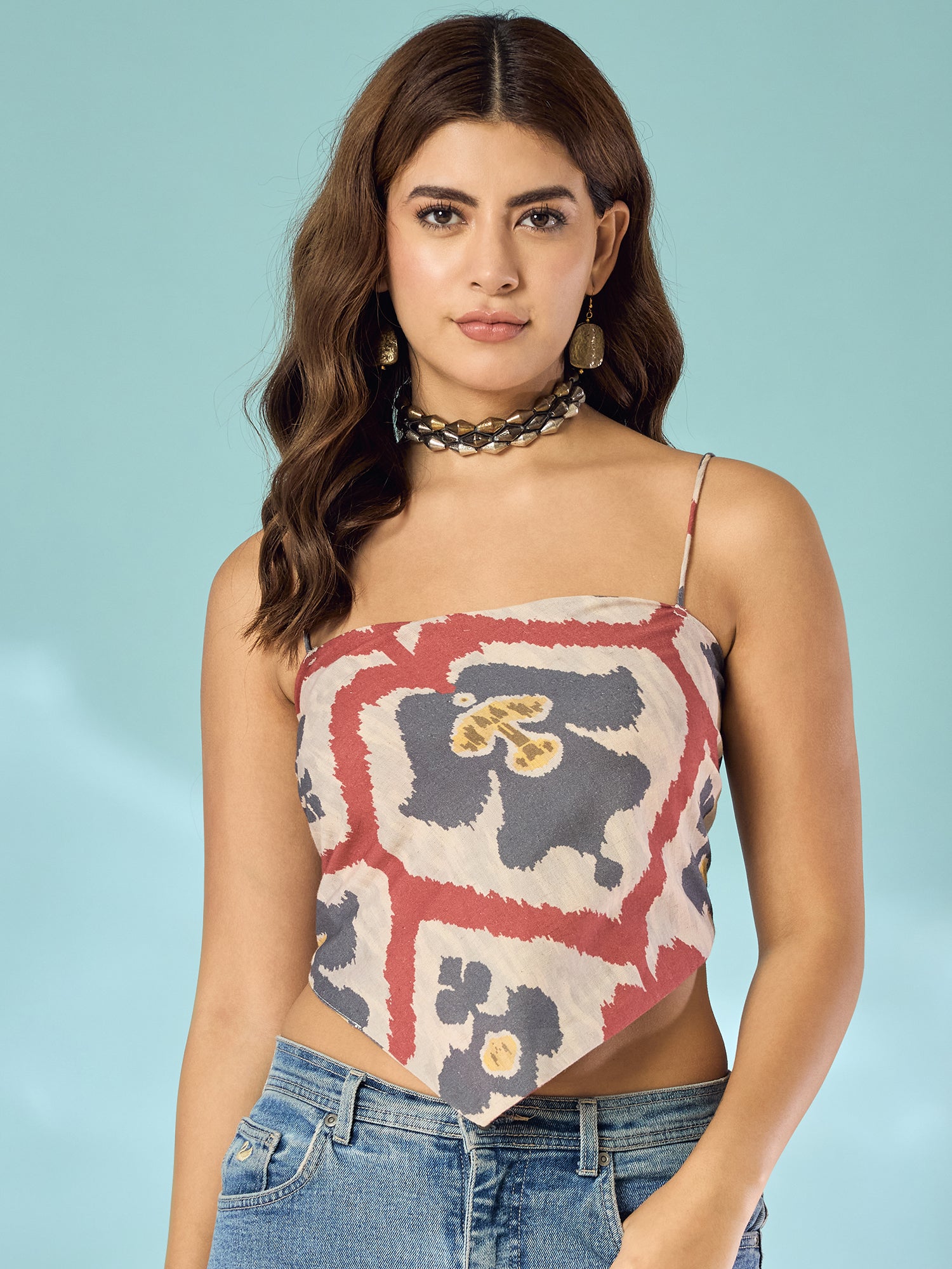 A sophisticated combination of beige, red, and grey hues, this Ikkat Scarf Top showcases timeless artistry. Pair it with denims or trousers for a chic fusion look that stands out.