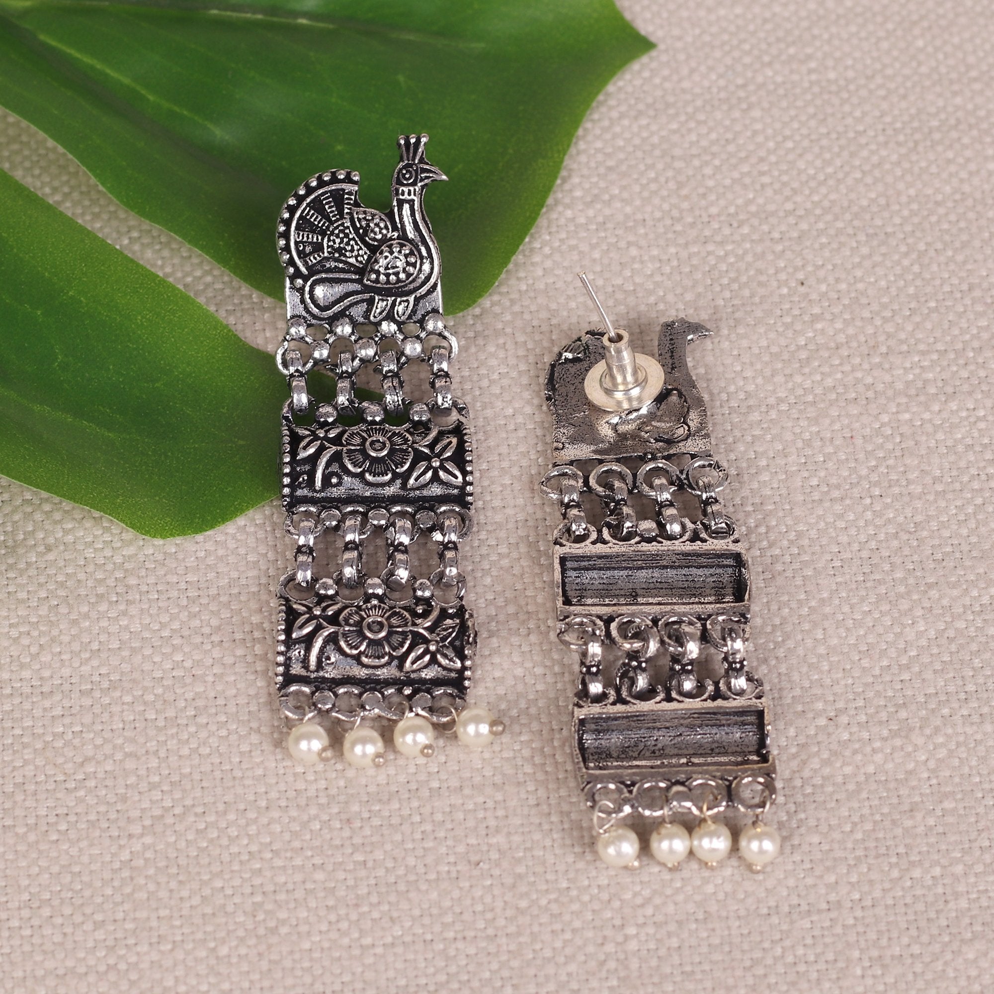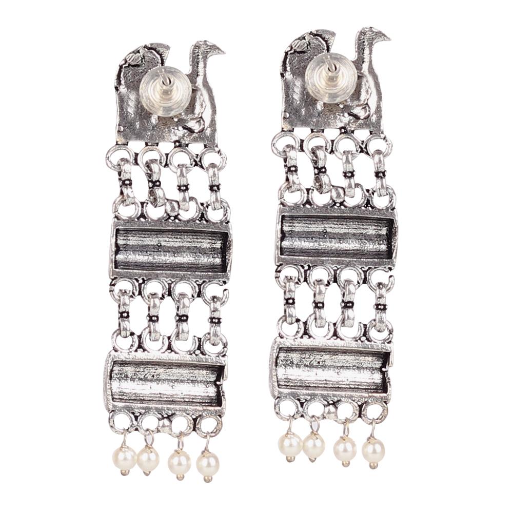 A pair of exquisitely oxidised silver earrings, handcrafted and exclusive for the woman of today. These muted design makes for the perfect everyday kind of piece. Perfect with Ethnic and Indo-western attires alike.