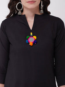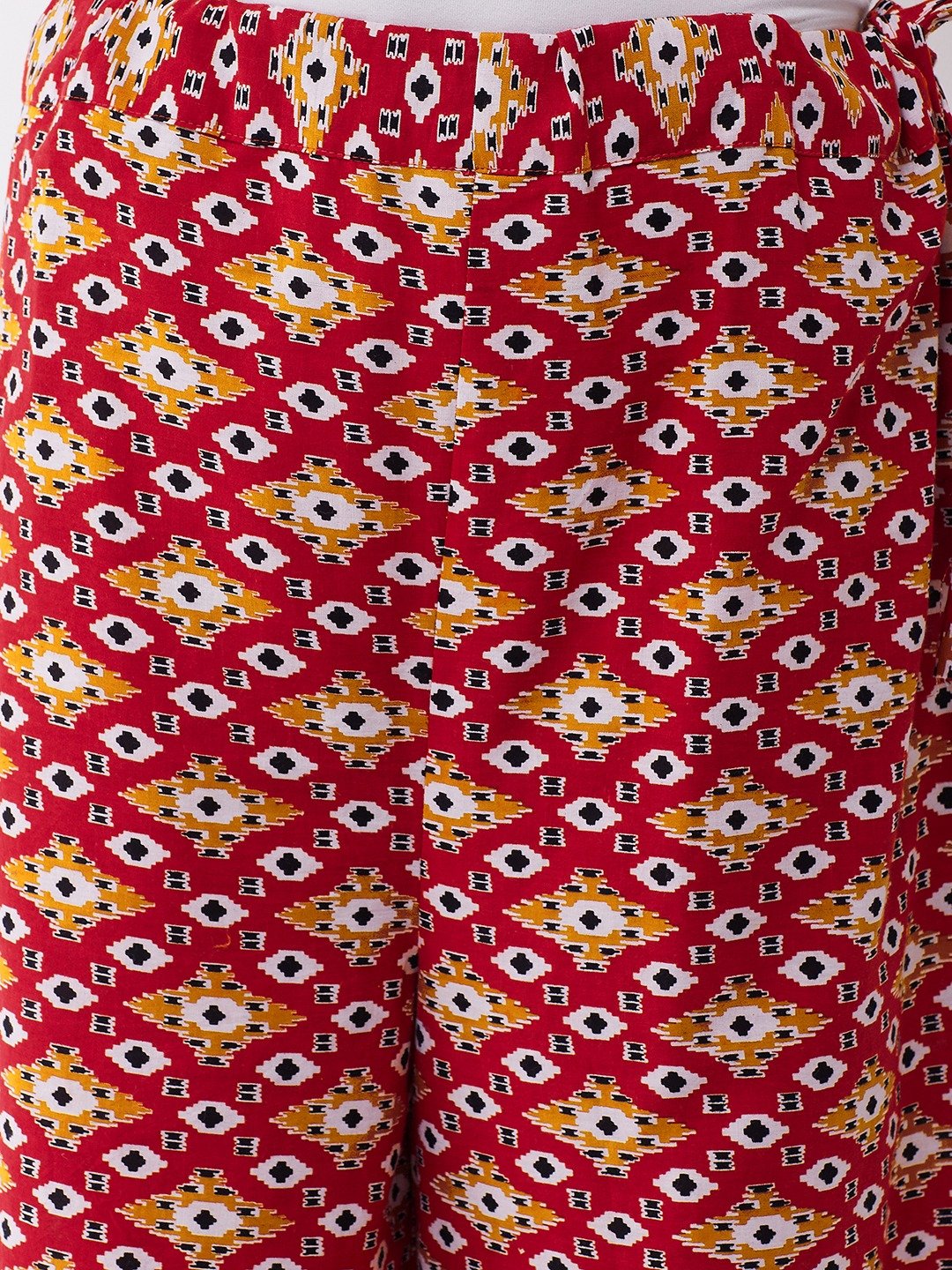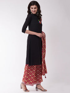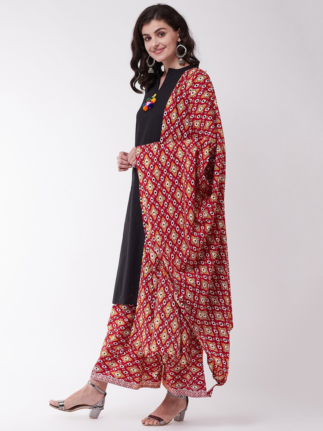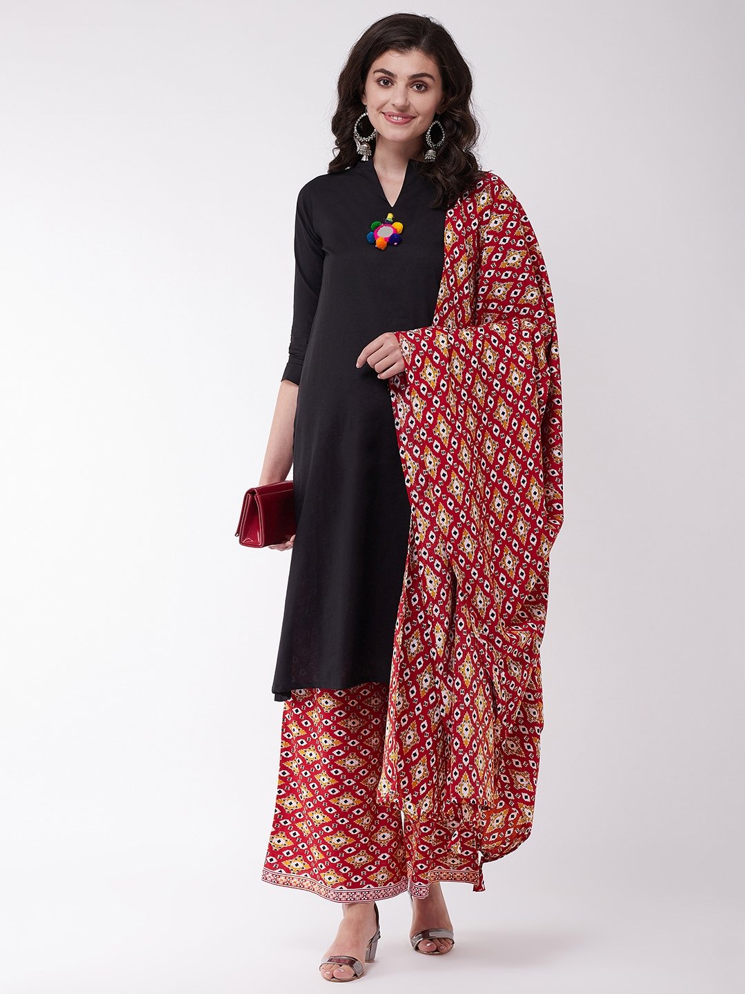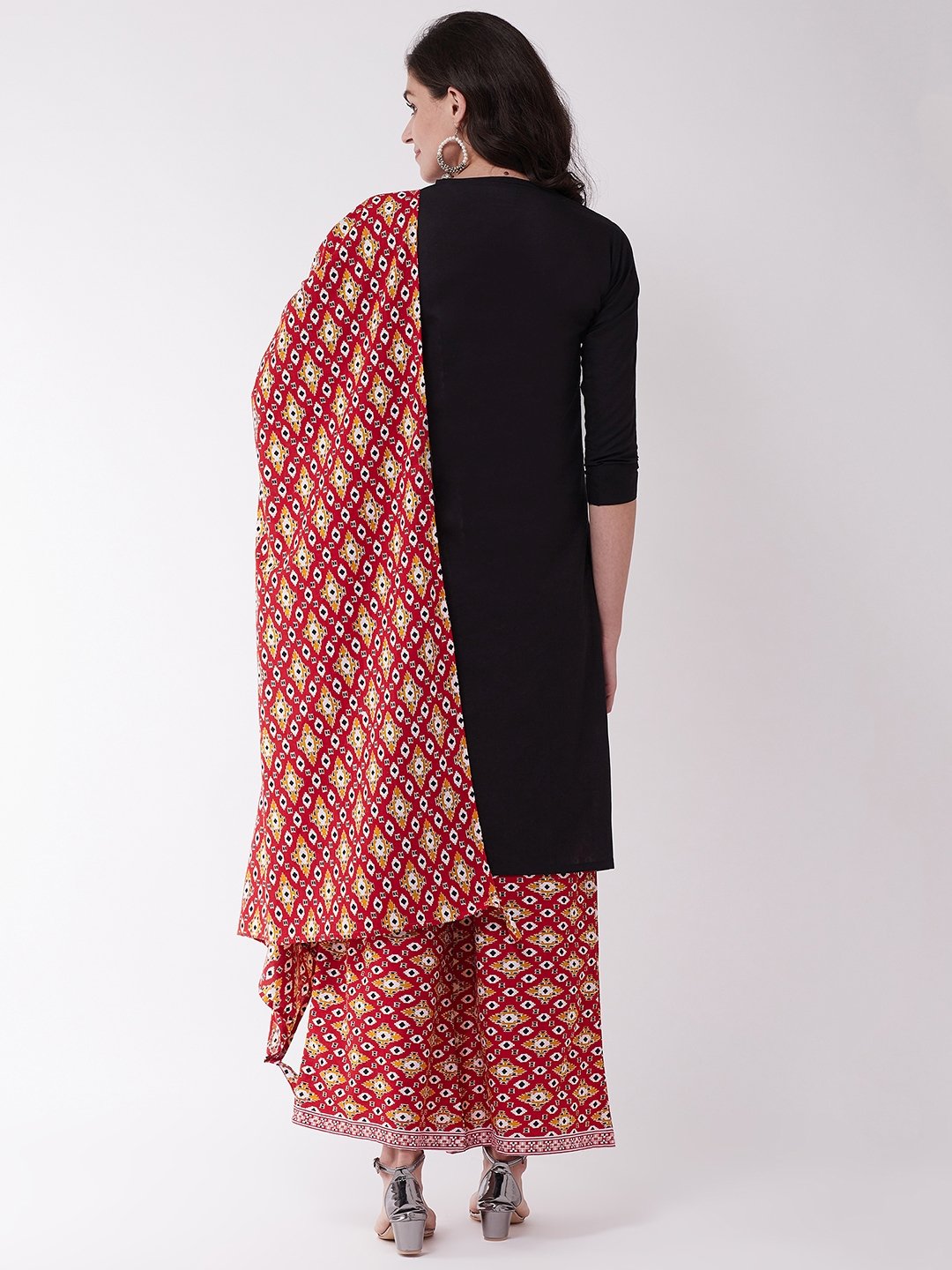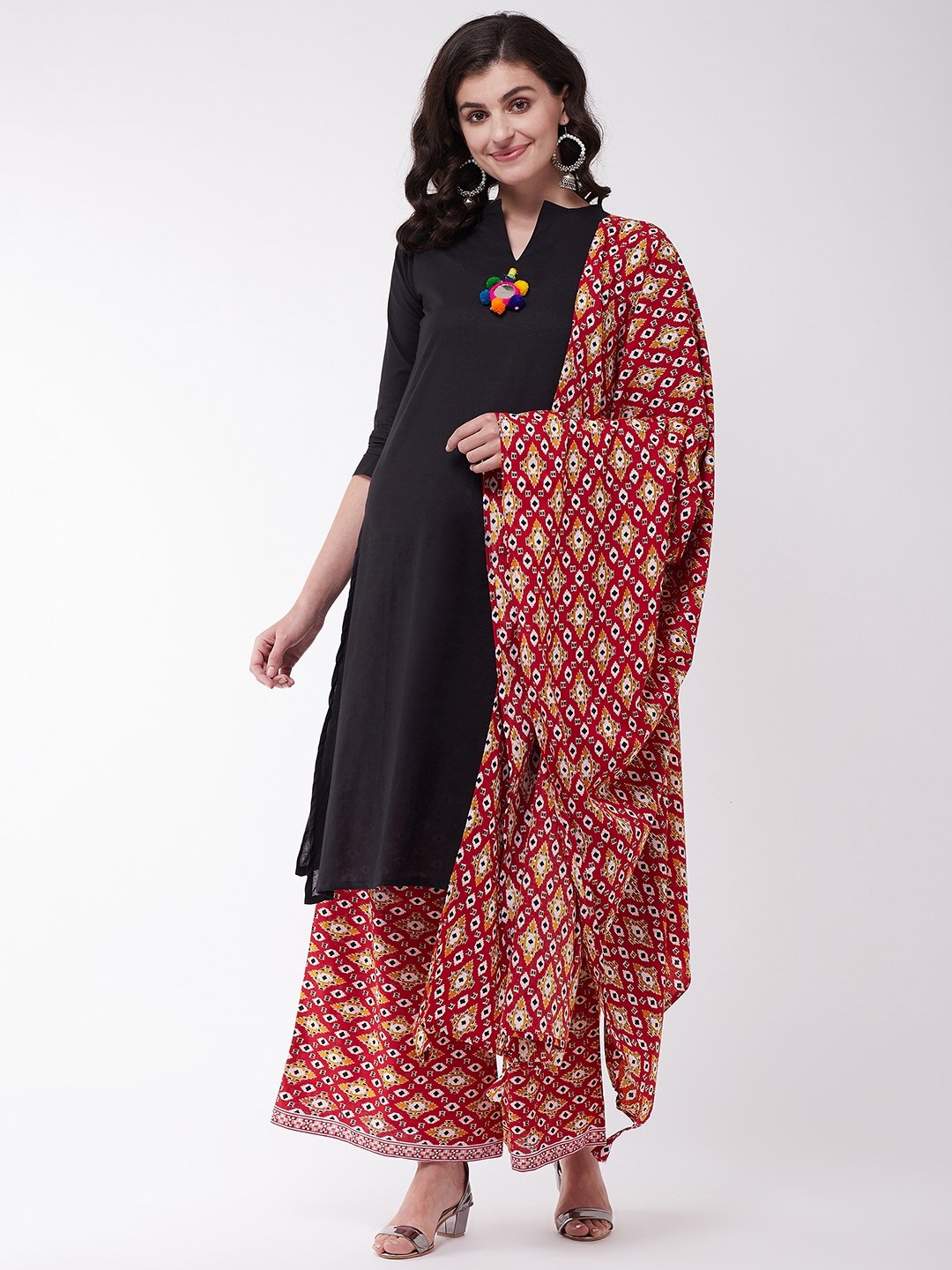 Shrug off that age old classic garb and buy this trendy black and red Patola kurta palazzo set. Spiff up your look by wearing oxidised jewellery set.