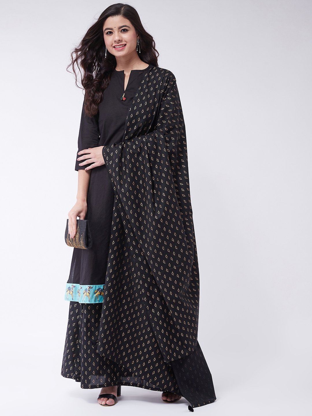 Get the most experimented styles in Indian wear like this black and golden coloured printed dupatta. It has a golden leaf printed design and charm to flaunt.