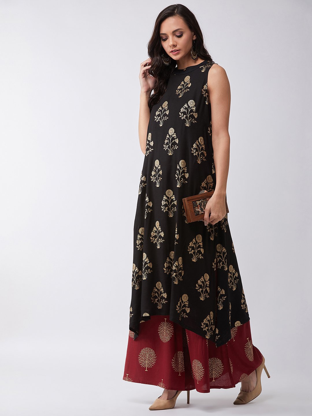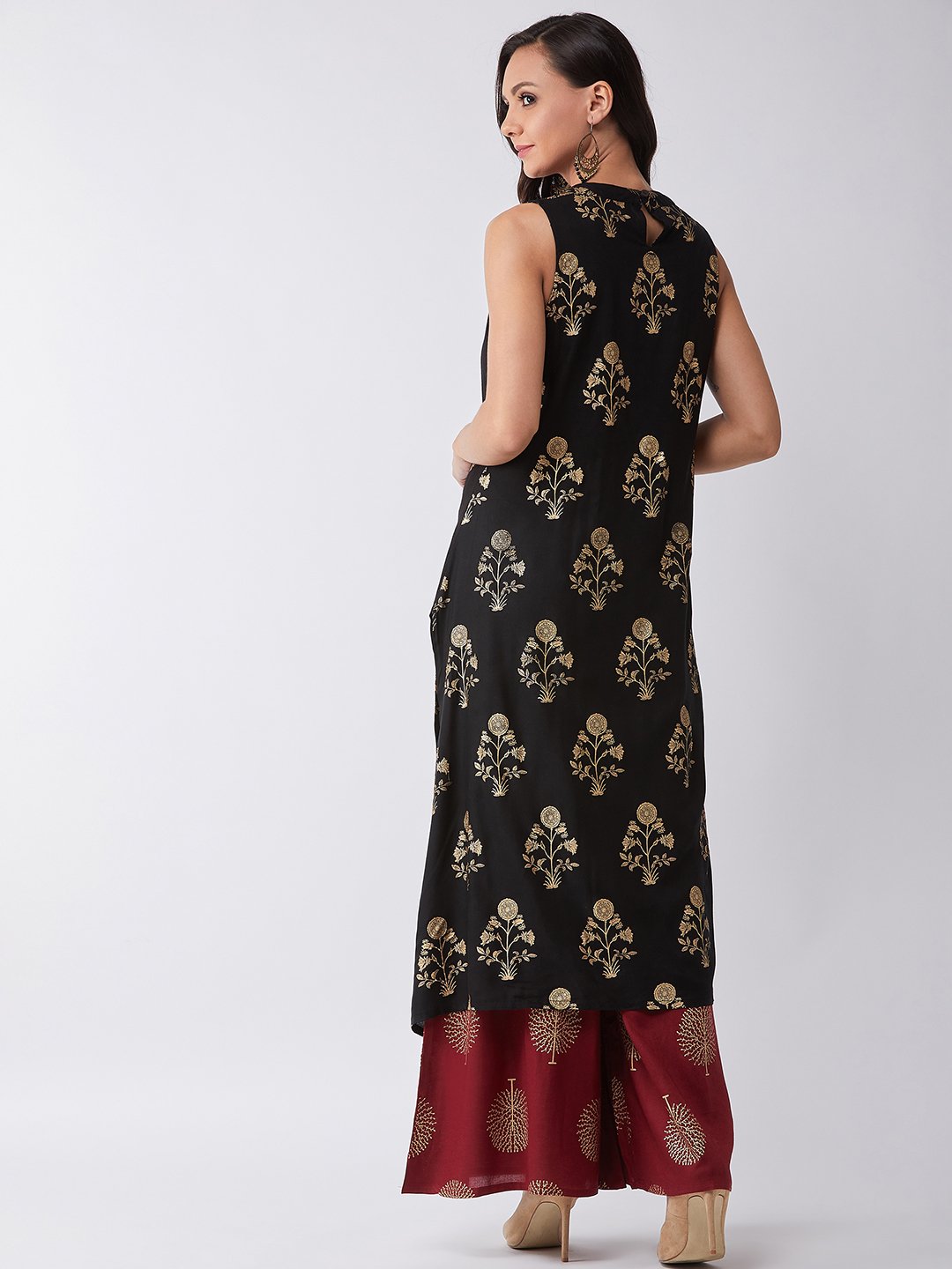 Accessorise your complete look like a showstopper by pairing this black gold work halter kurta and palazzos set with Indian jewellery and trinkets.
