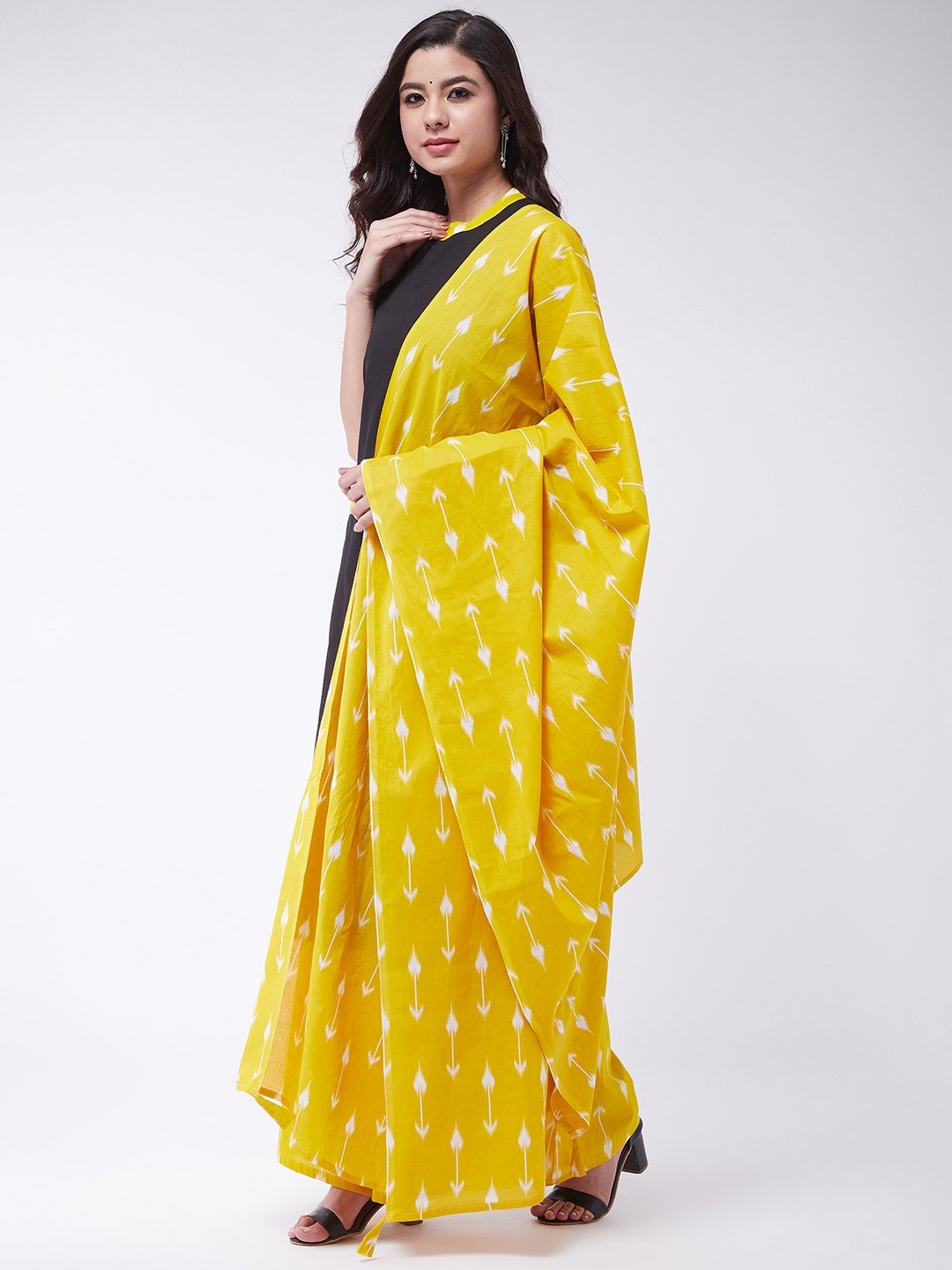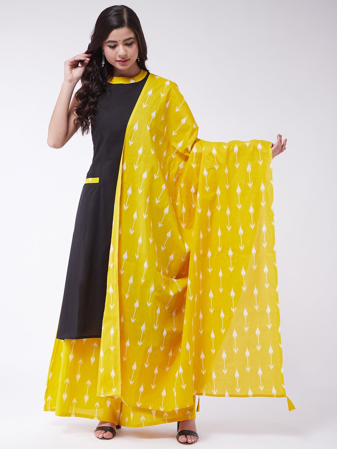Introduce summer time€™s new fashion by wearing this black halter kurta with yellow palazzo and dupatta set. Wear this set with Chand Baalis and heels.