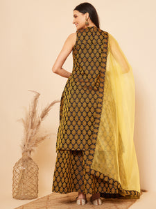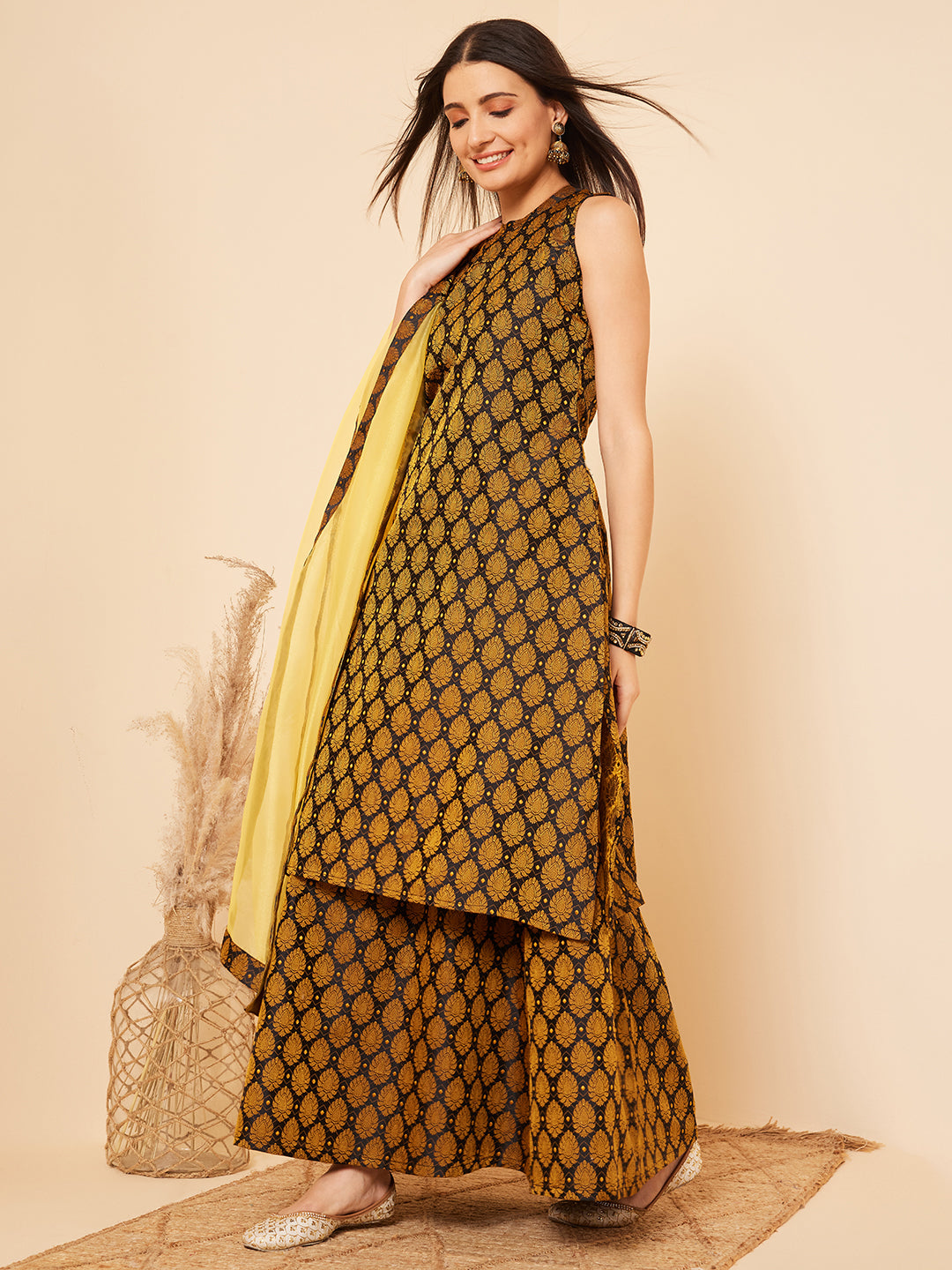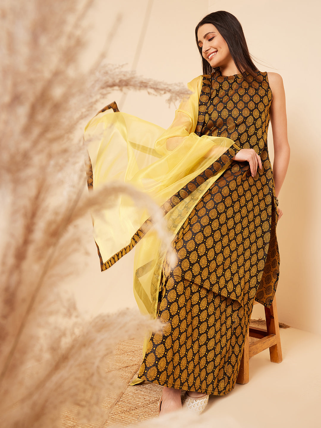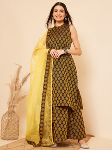 Black Jacquard Halter Kurta Set W Yellow Or Dupatta