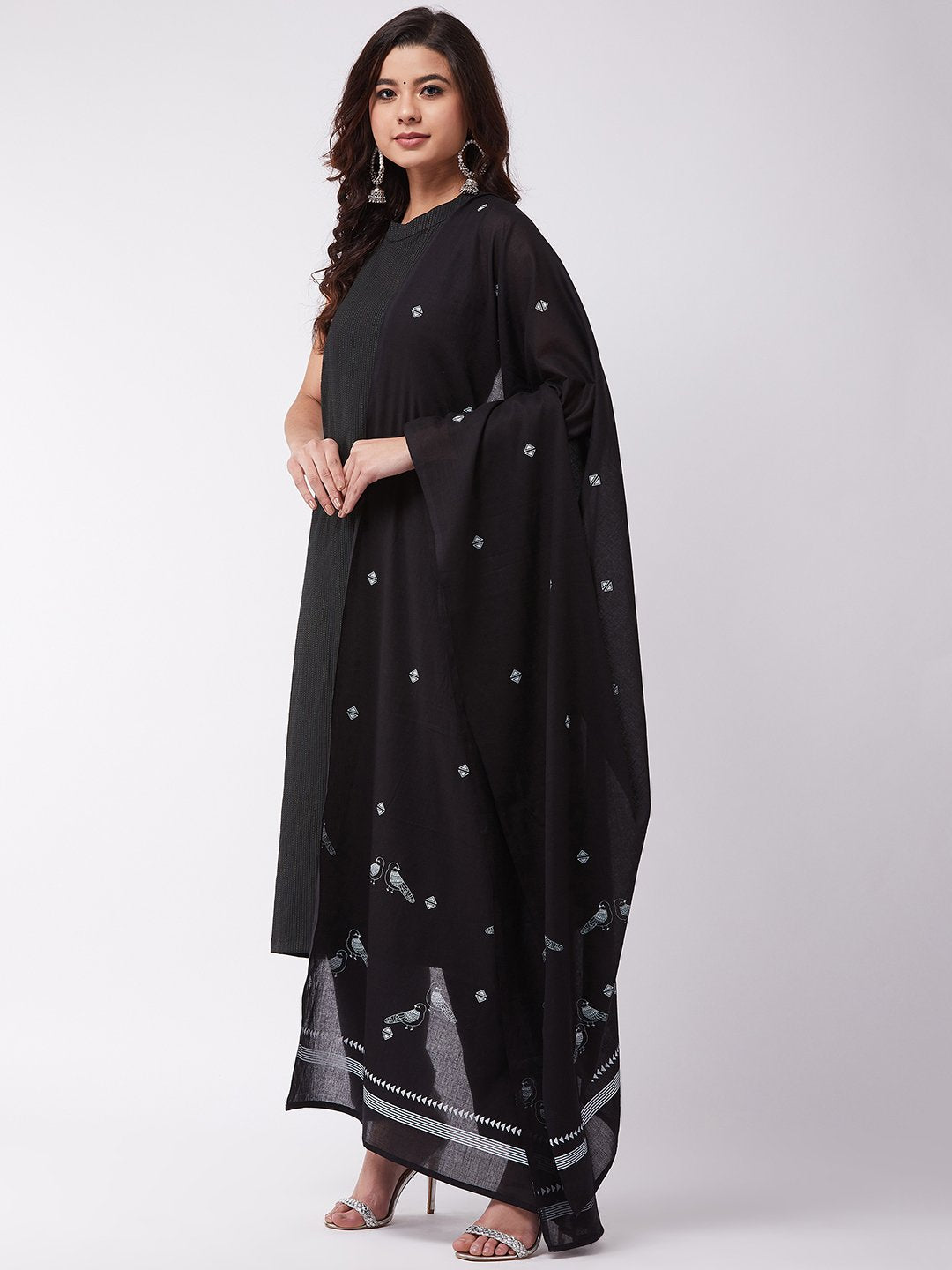 Dupatta, if any, has a length of 225 cms / 2.25 m / 88.5 inches. Width is 107 cms / 42 inches