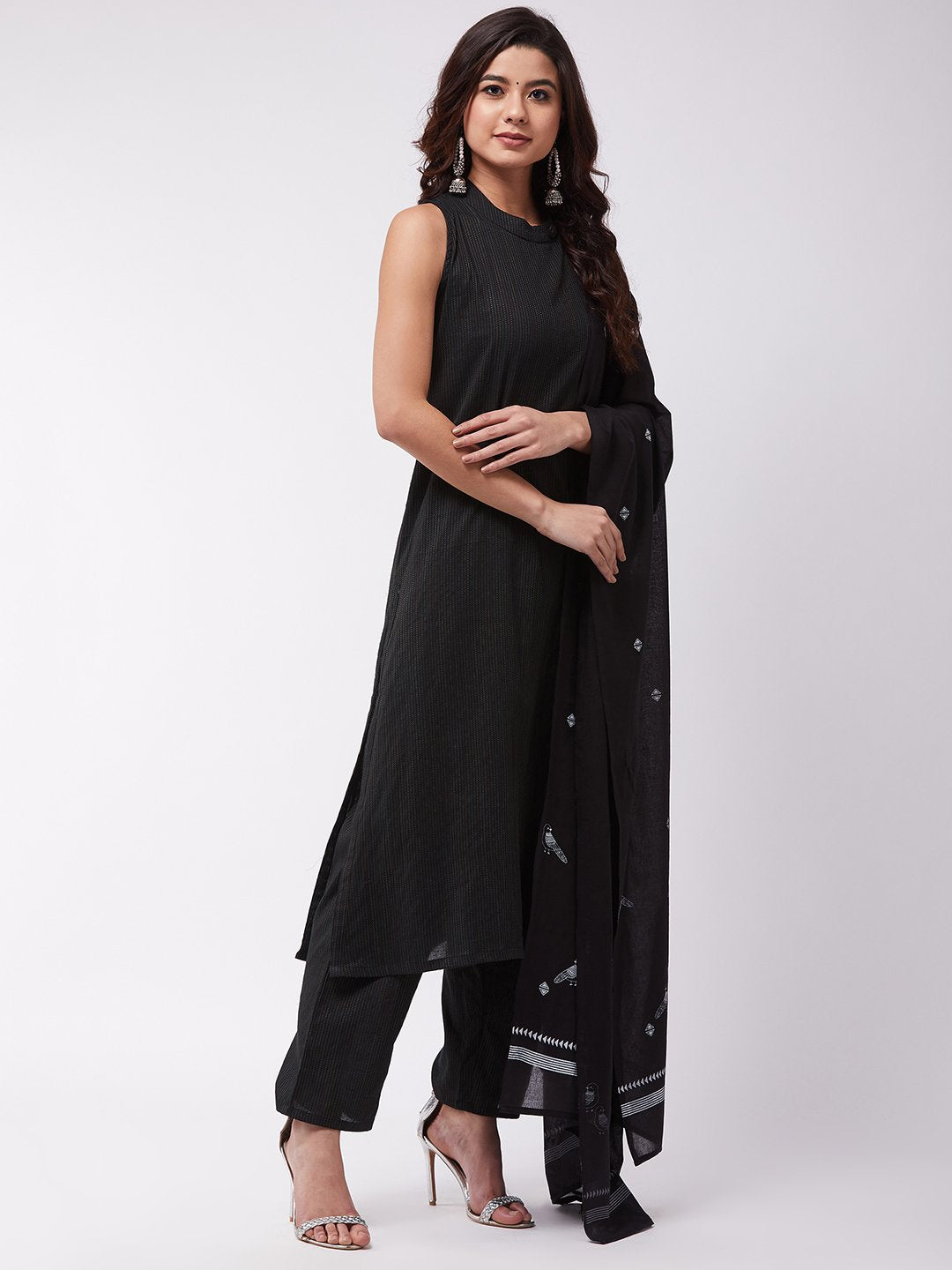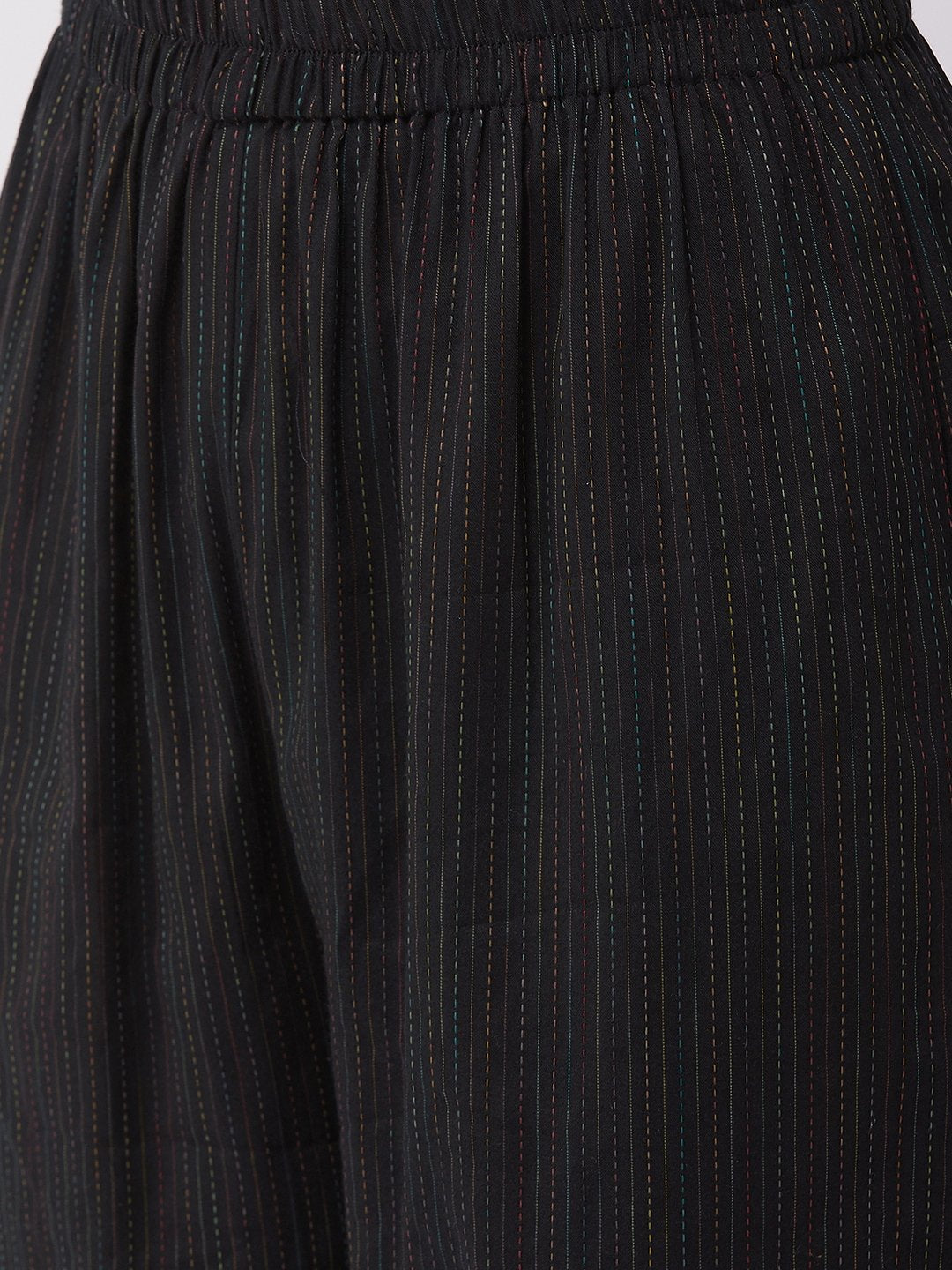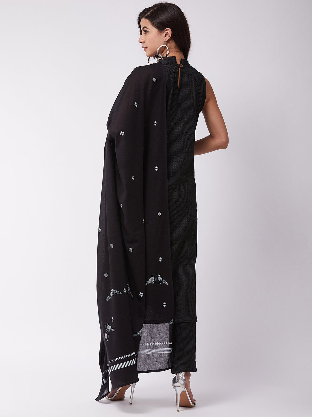 A ravishing sartorial pick to flaunt in traditional events, this black kantha work halter kurta and pants set is a right catch for you. Get it done with drop earrings and heels.