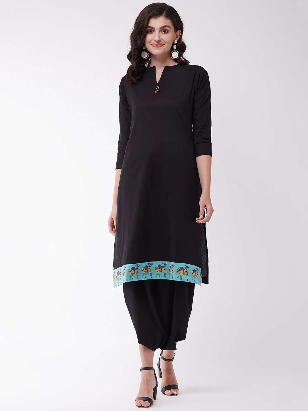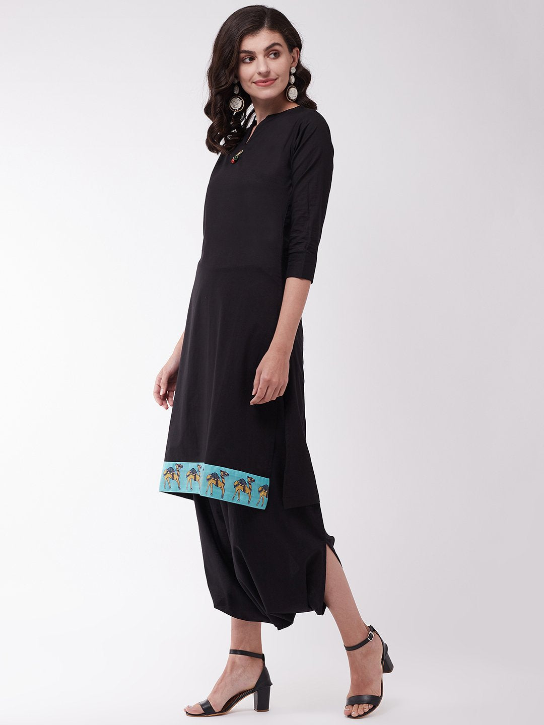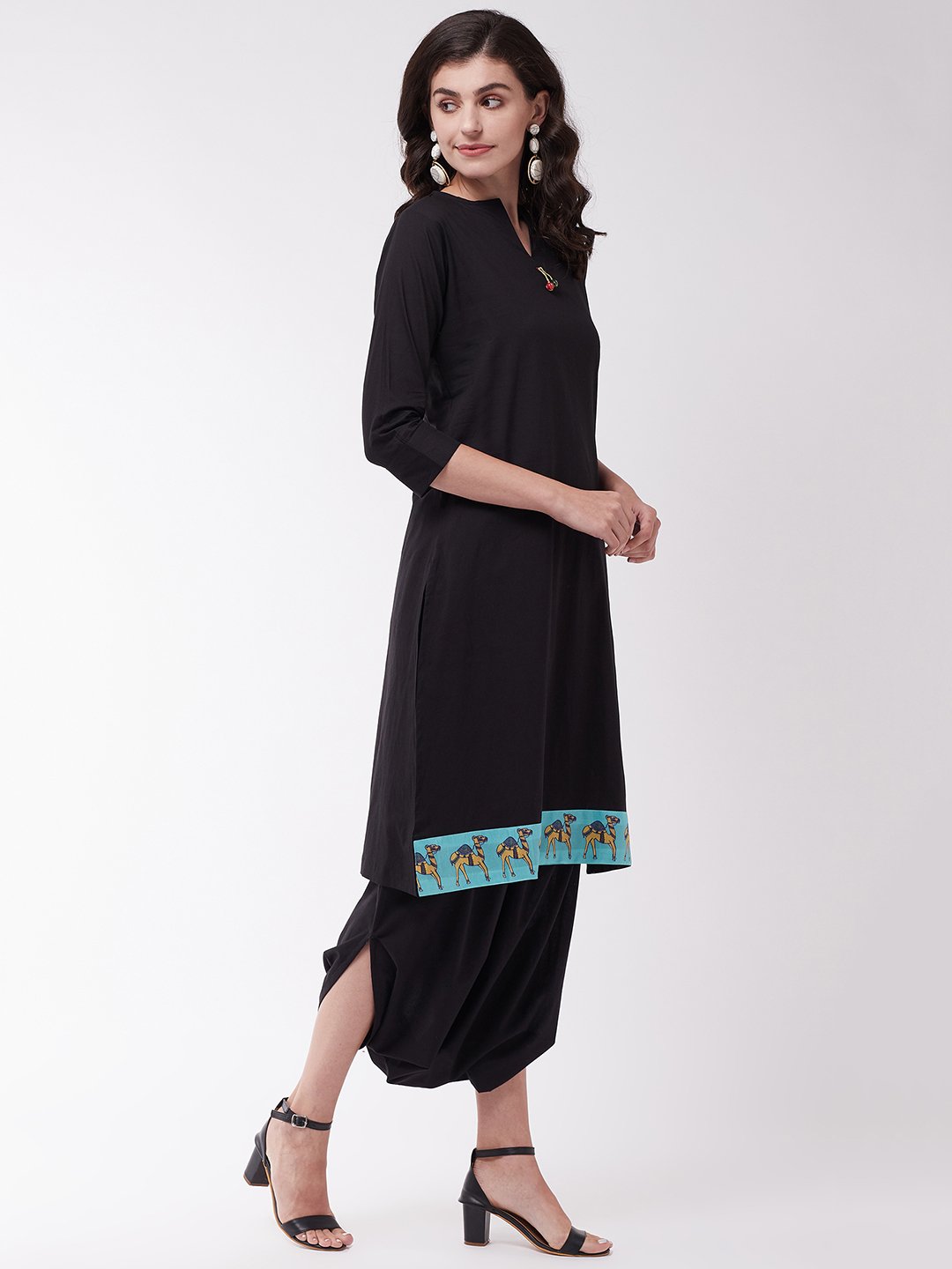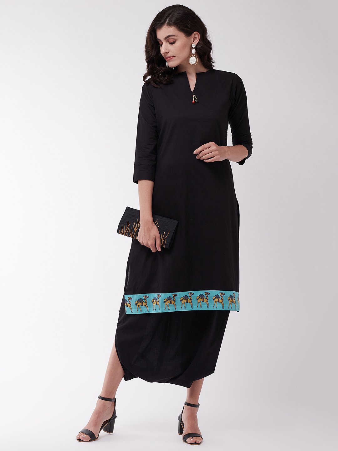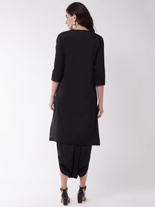 Change your entire look immediately with a glamorous one with this black kurta and cowl dhoti set. Wearing heeled sandals will be a good option here.
