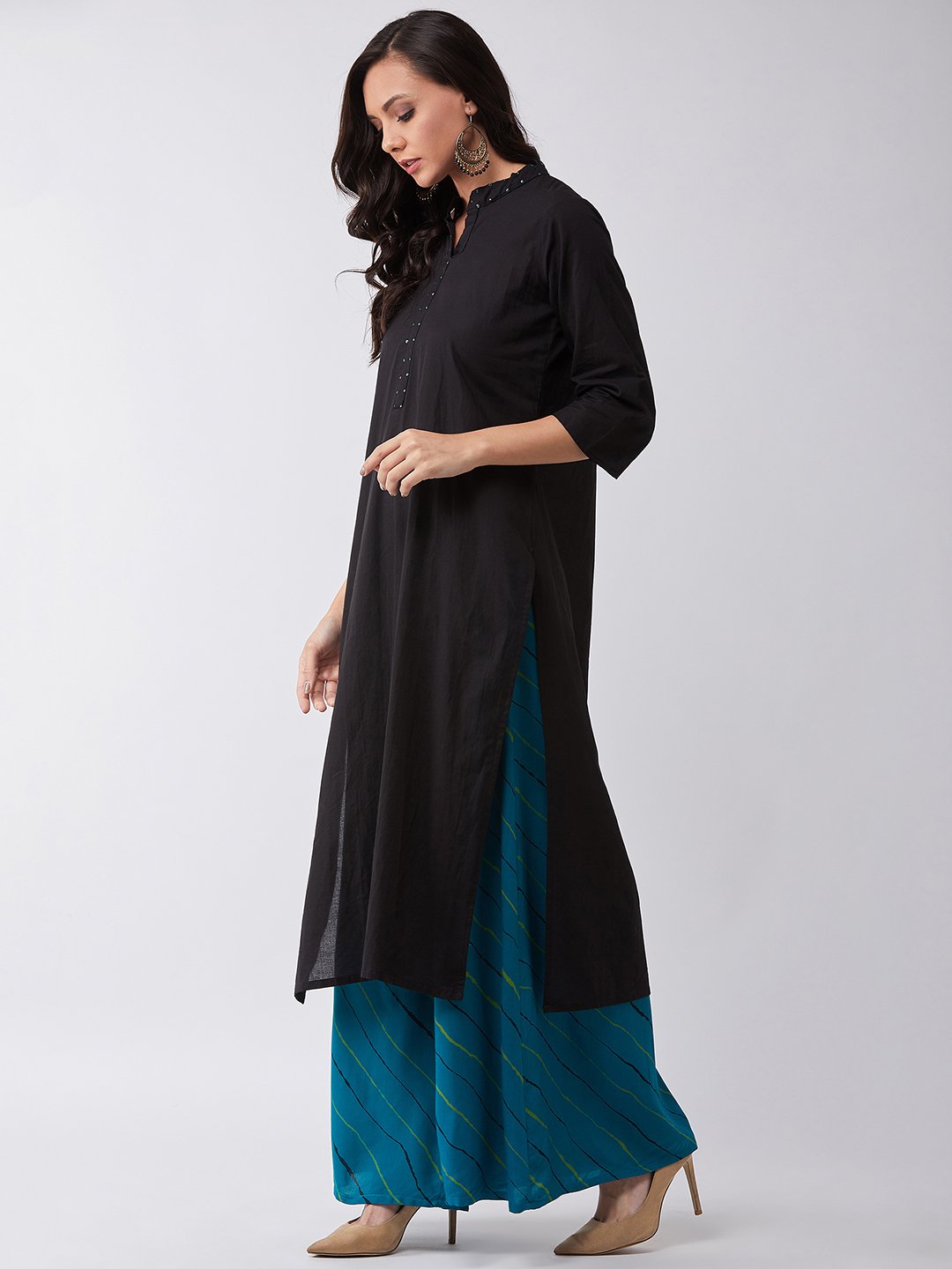 Add some pretty colour to your ethnic fashion wardrobe by investing in this black kurta with blue sequins work. Shimmer it with classic palazzos and jhumkis.