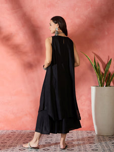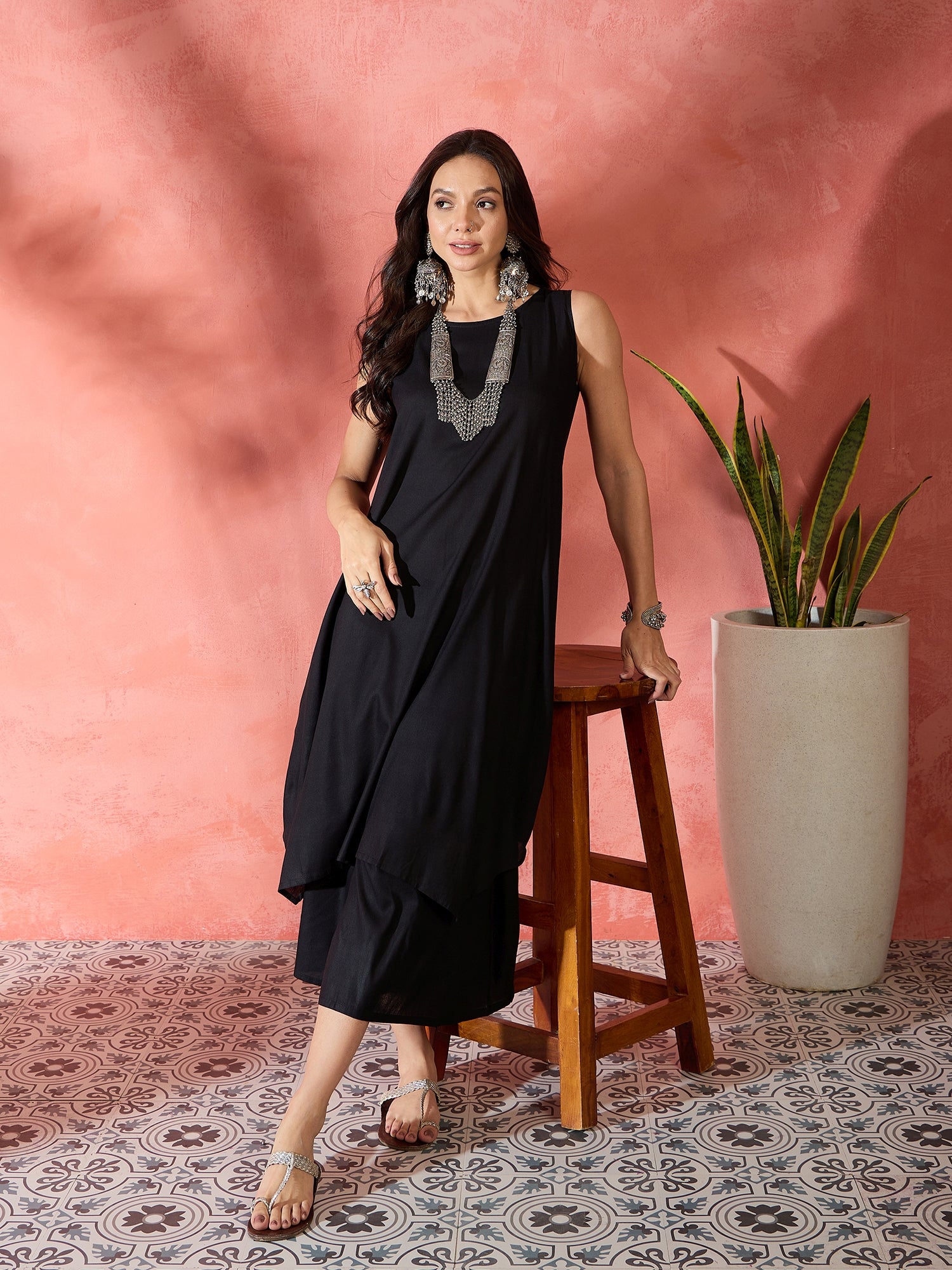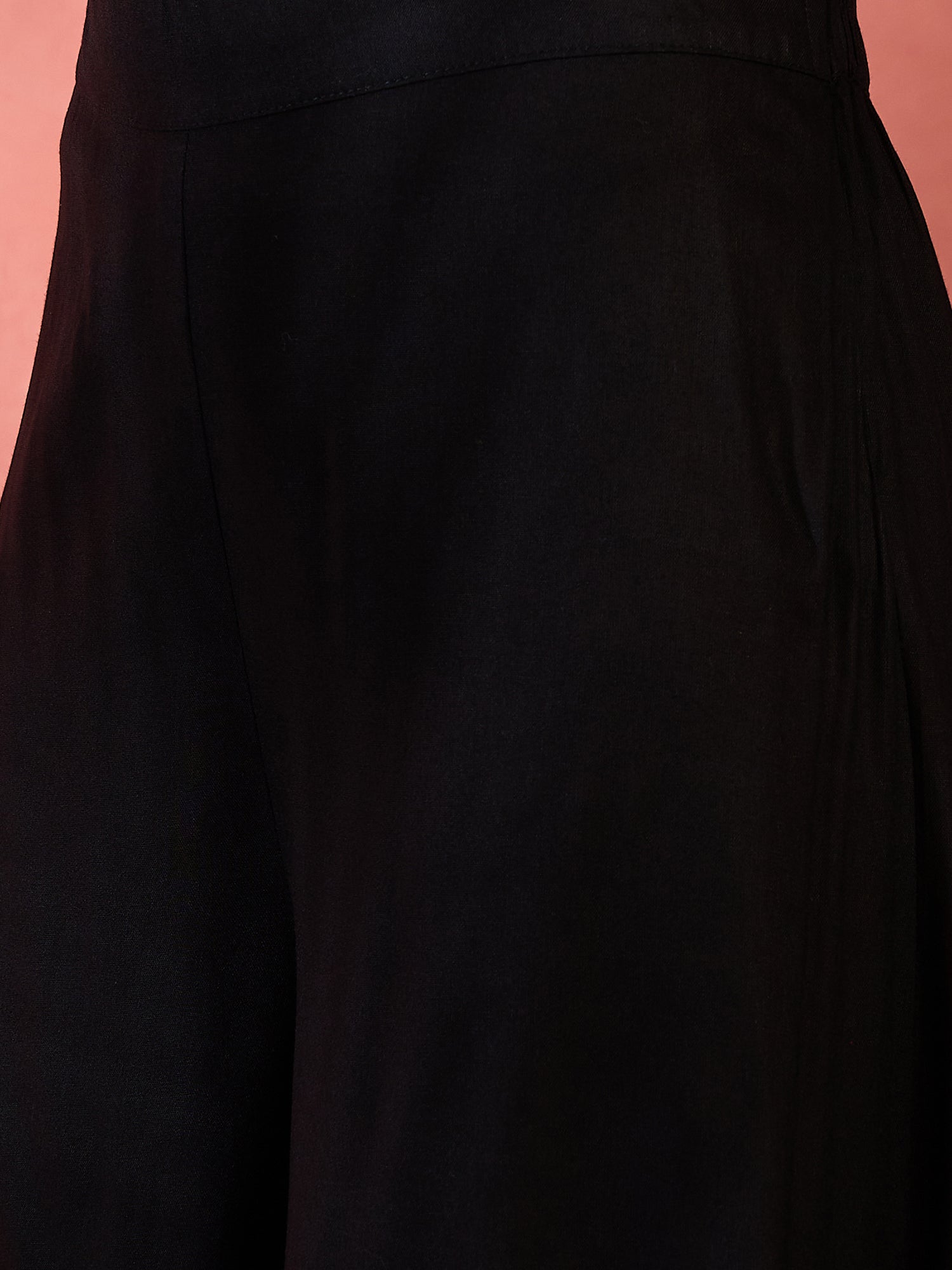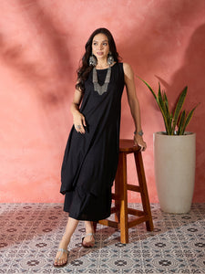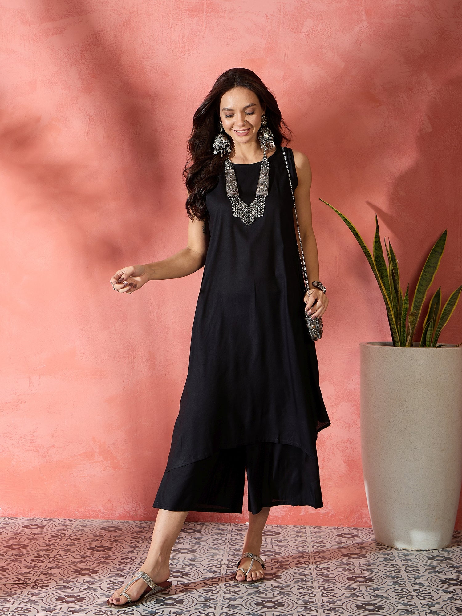 The Black R Neck Kurta Short Palazzo Set is a stylish and contemporary outfit that combines comfort with elegance. The kurta features a unique round (R) neckline, offering a sleek and modern appearance.