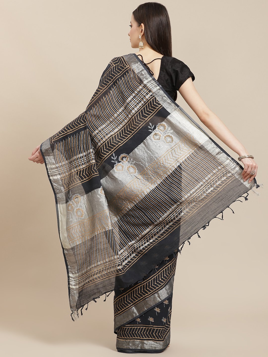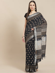 Our Block Printed Sarees, inspired by Indian Crafts. A stylish offerring for any family function or a get together of friends Fabric used : Pure Linen. Dry Clean Only. This Saree comes with an un-stitched blouse