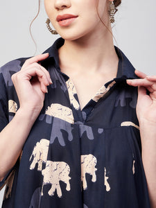 Blue Elephant printed Flared Dress, has a round neck, three-quarter sleeves, Bell sleeve,and flared hem. Maintain a trendy style all year long with this stunning dress from InWeave. Dress to impress on your first date and pair your printed blue piece with fun pumps and a stylish purse.